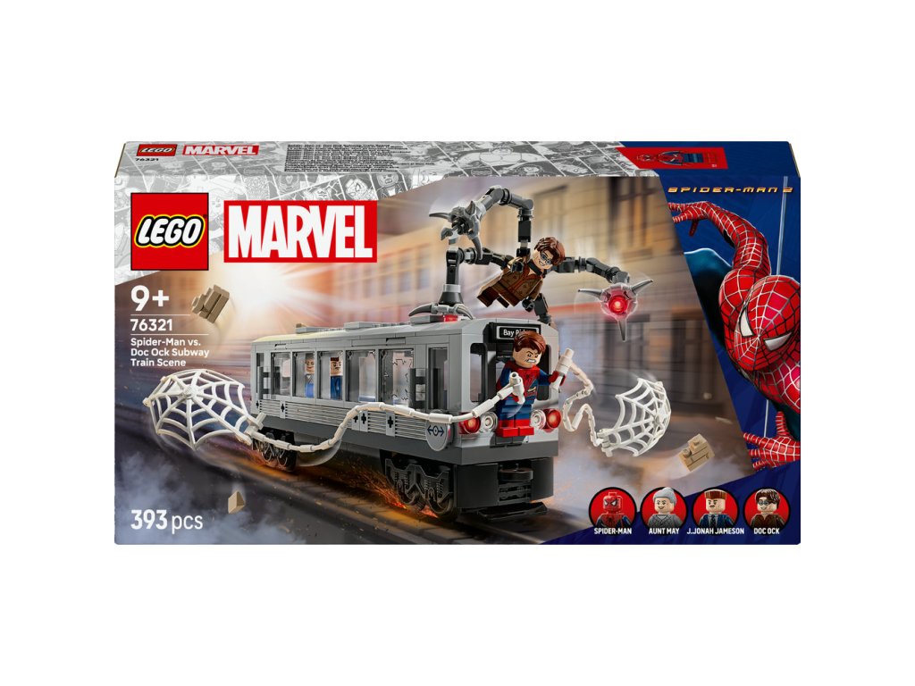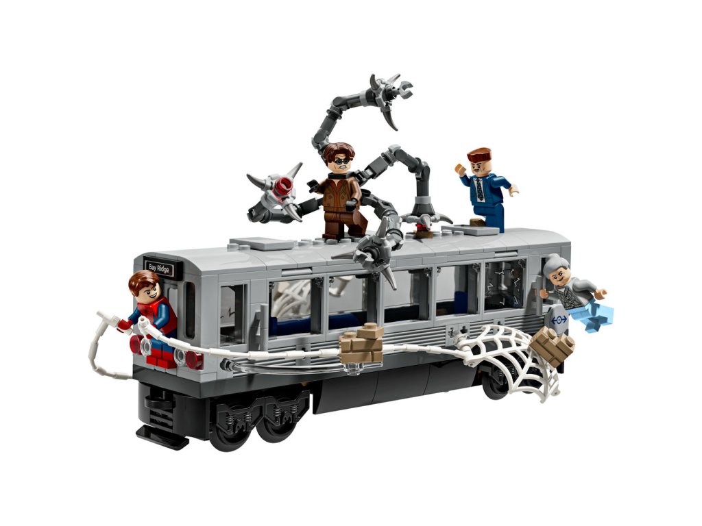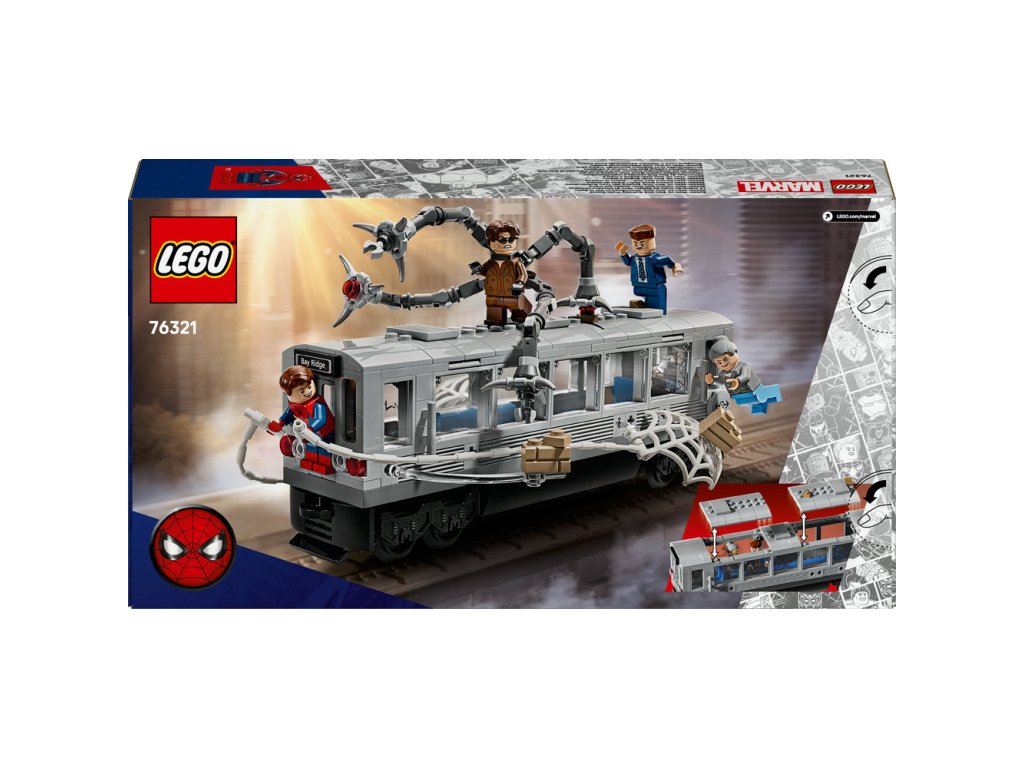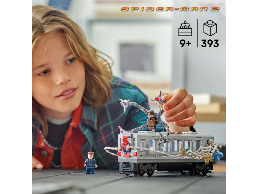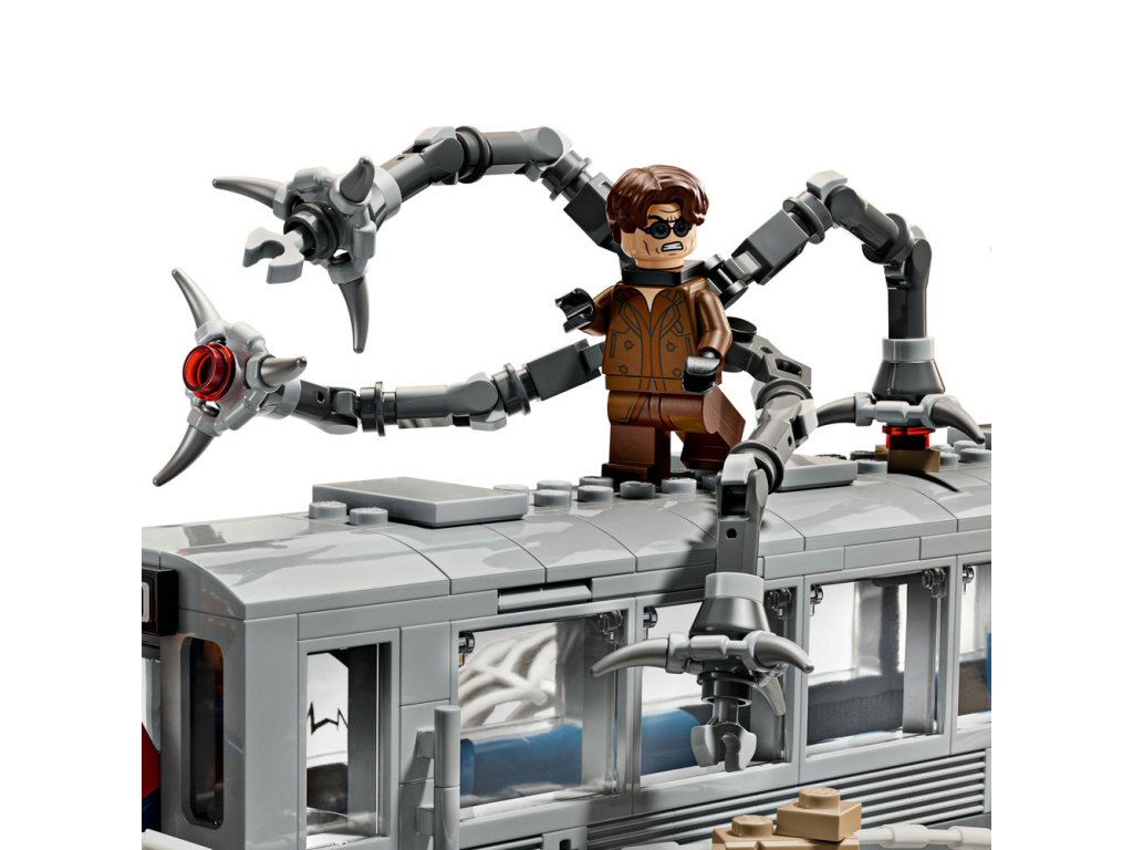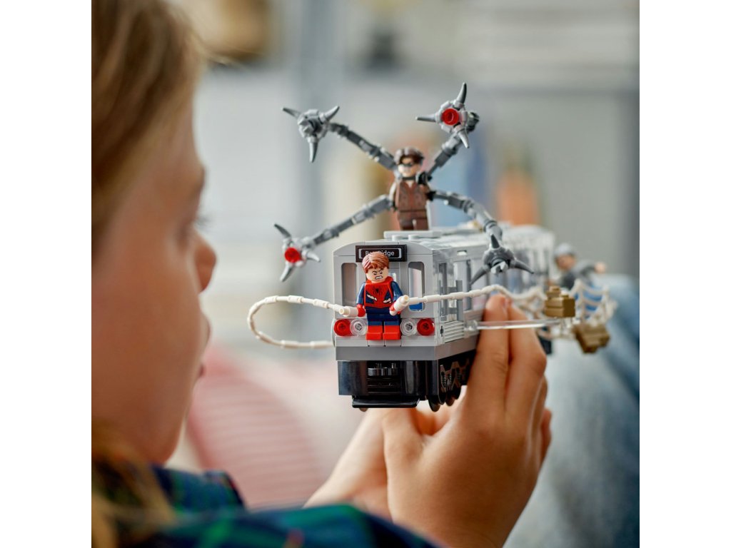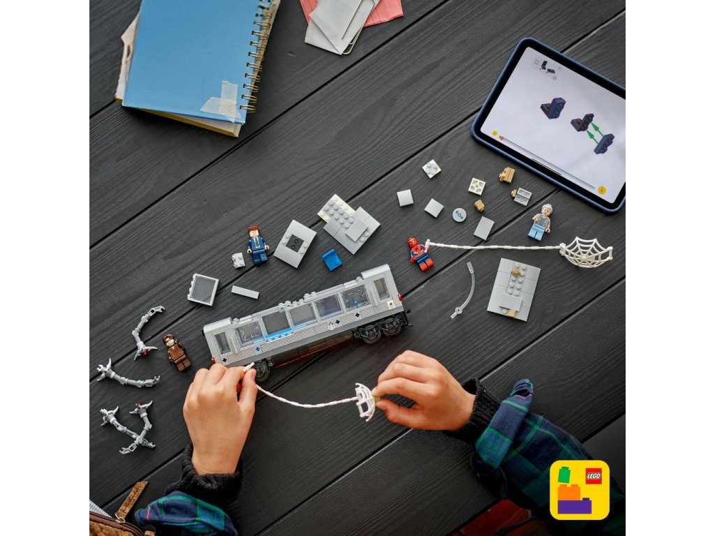 Táto stavebnica so superhrdinami v metre je založená na ikonickej scéne z filmu Spider-Man 2 od štúdia Marvel. Model obsahuje 4 minifigúrky: J. Jonaha Jamesona, tetu May, Spider-Mana a Doca Ocka. Minifigúrka Spider-Mana má vymeniteľné hlavy – maskovanú a nemaskovanú – a veľkú pavučinu, ktorú môžete pripevniť na vlak. Minifigúrka Doca Ocka má 4 kĺbové chápadlá; dva s prvkami laserových lúčov a 2 s klipmi, ktoré pripevníte na vlak. Zdvíhacia strecha poskytuje prístup dovnútra vlaku, kde je miesto na sedenie pre minifigúrku cestujúceho. Ešte viac digitálnej zábavy si stavitelia užijú vďaka intuitívnej aplikácii LEGO Builder, kde si môžu modely približovať, otáčať v 3D a sledovať svoj pokrok. Stavebnica obsahuje 393 dielikov.