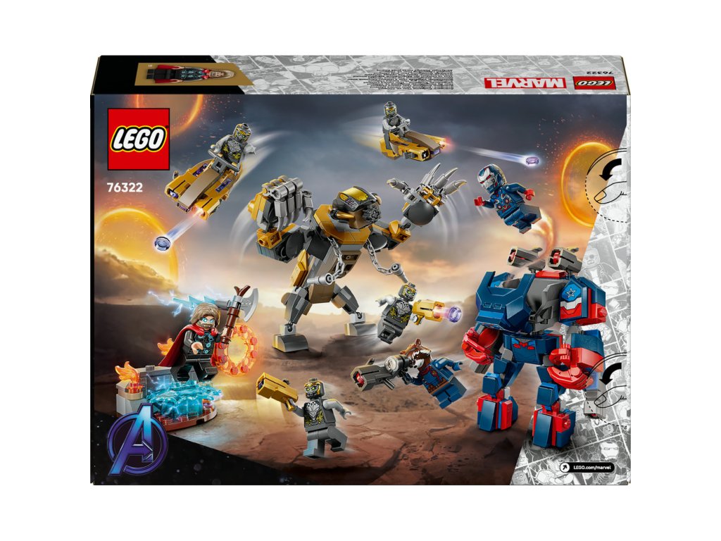 Táto Marvel stavebnica so superhrdinami je založená na kultovej bojovej scéne a obsahuje 2 veľké figúrky LEGO: robota Iron Patriota so 4 vystreľovačmi projektilov a hrôzostrašnú gorilu Chitauri. Obe figúrky sú kĺbové, takže deti si užijú dynamické hry. V modeli je aj 7 minifigúrok: Iron Patriot MK2; Rocket s veľkým vystreľovačom projektilov; Thor so Stormbreakerom a štyria Chitauri, z ktorých dvaja majú zlaté vystreľovače projektilov. Medzi ďalšie prvky patria 2 skútre a malé prostredie pre Thora, kde môžete uložiť náhradné projektily. Skombinujte túto stavebnicu s modelom Avengers: Endgame Posledný súboj (76323) a užite si ešte lepší herný zážitok. Stavitelia si navyše môžu približovať a otáčať modely v 3D pomocou zábavnej a intuitívnej aplikácie LEGO Builder. Model obsahuje 373 dielikov.