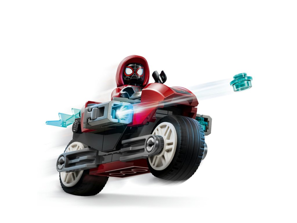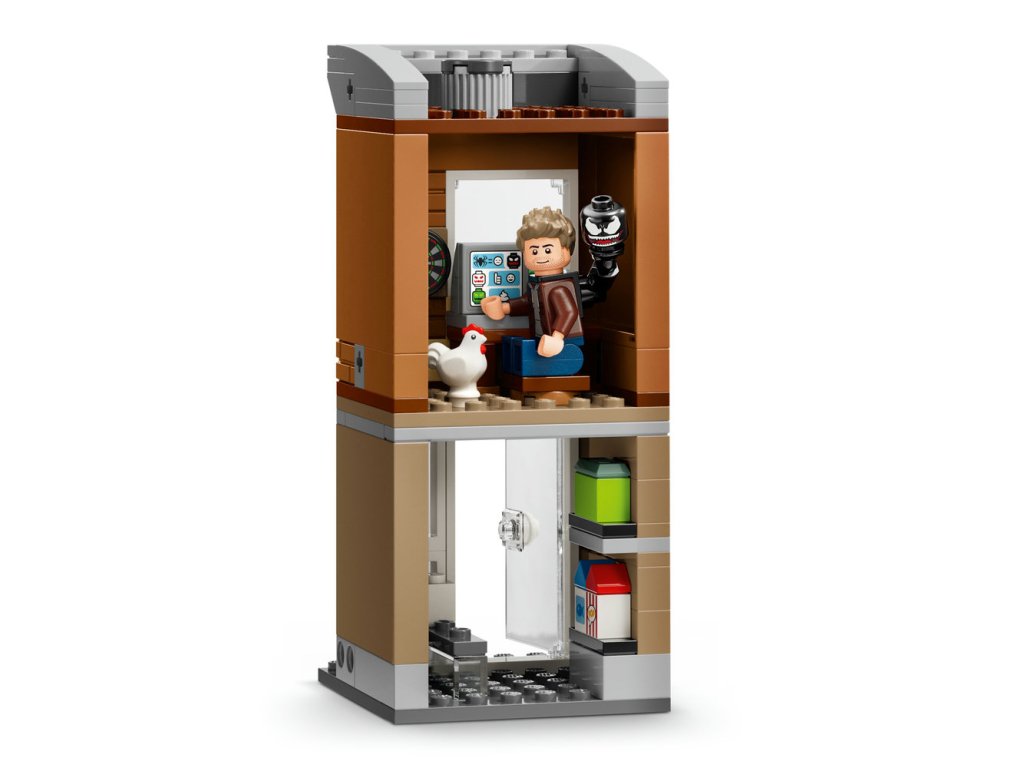 Pouličná scéna obsahuje 3 osobitné budovy: byt Milesa Moralesa s klenotníctvom na prízemí, kancelársku budovu Oscorp a Venomov byt s večierkou pod ním. Každá izba je zariadená nábytkom a doplnkami. 8 minifigúrok LEGO z filmov Marvel sa postará o nekončiacu akciu a vrhanie pavučiny: Spider-Man, Spider-Woman, Miles Morales na motorke, Eddie Brock, Ghost-Spider, Norman Osborn, Lovec Kraven a Zelený Goblin s klzákom. Vďaka priehľadným paličkám môžu deti nasmerovať postavy do rôznych realistických póz. Stavajte spoločne v aplikácii LEGO Builder, kde si priatelia a rodina užijú spoločnú tvorivú zábavu. Model obsahuje 808 dielikov.
