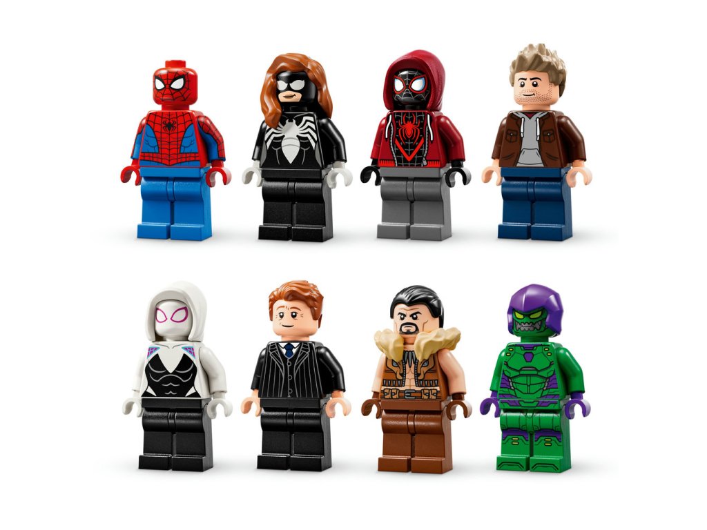 - Minifigúrky superhrdinov – Stavebnica obsahuje 8 minifigúrok LEGO®: Spider-Mana, Spider-Woman, Milesa Moralesa, Eddieho Brocka, Ghost-Spidera, Normana Osborna, Lovca Kravena a Zeleného Goblina
