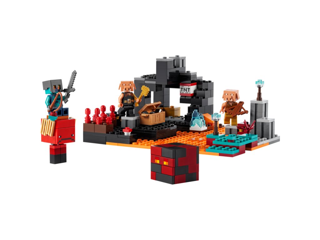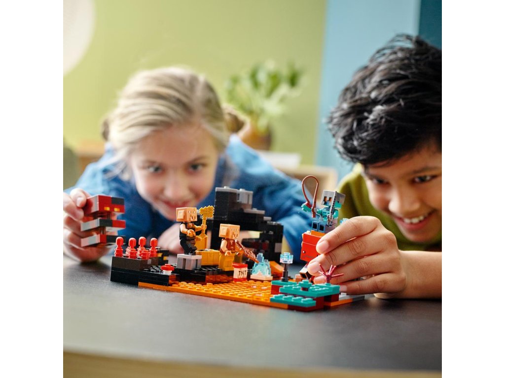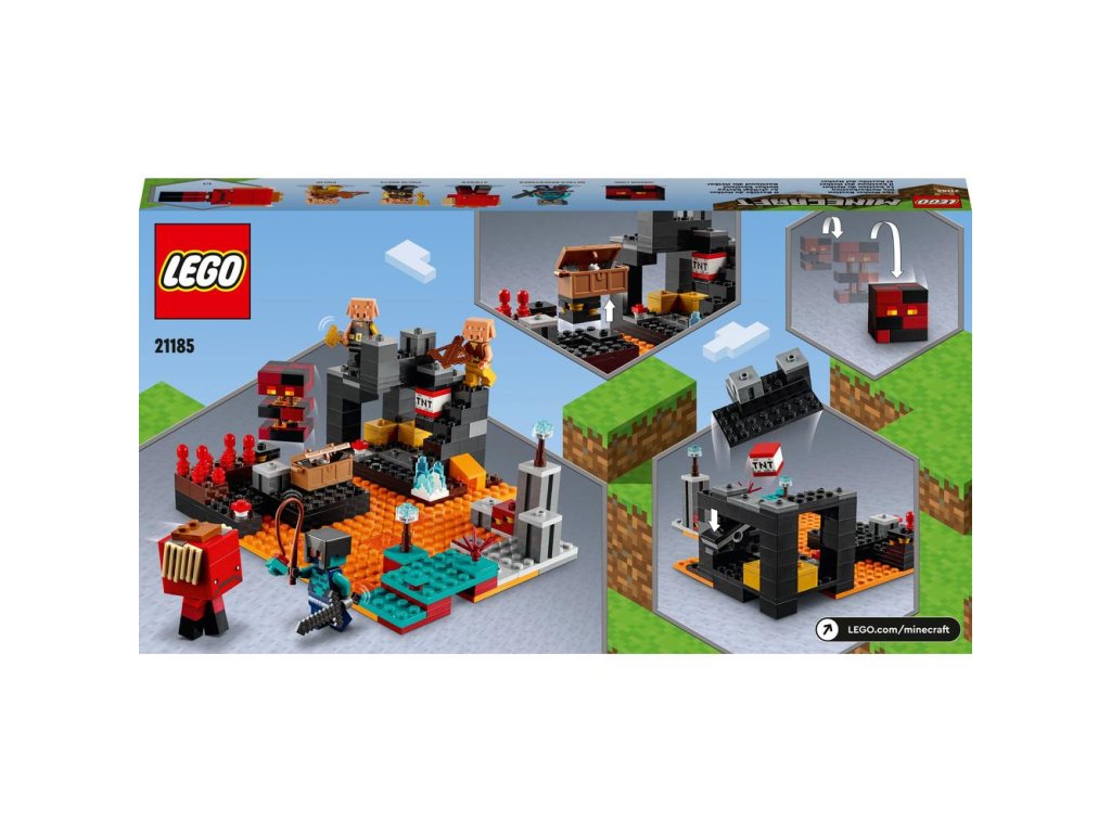 Deti od 8 rokov, ktoré zbožňujú Minecraft®, si so stavebnicou LEGO® Minecraft Podzemný hrad (21185) užijú nekonečnú akciu v skutočnom svete. Misia v duchu Minecraftu plná aktivít Hráči sa prebojujú do ohnivého podzemného hradu, zdolajú výzvy a nazbierajú predmety, ktoré im otvoria dvere do ďalších hier. Medzi postavami z Minecraftu nájdu podzemného dobrodruha, pekelný sliz, bojového piglina, piglina a chodca. Nechýba ani séria špeciálnych prvkov, ako je napríklad funkcia explózie, ktorú deti aktivujú vložením výbušniny a stlačením páčky. V sete deti spoznajú aj autentické doplnky z hry vrátane ďatelinového koreňa, skrútenej huby, pozláteného čierneho kameňa, podzemnej bradavice, červených húb, pochodní duší, zlatých tehličiek, podzemnej zlatej rudy a oheň duší, ako aj rad zbraní – zlatú sekeru, kušu a netheritový meč – TNT, rybársku udicu a truhlicu s netheritovými zvyškami, železnými nuggetami a brav