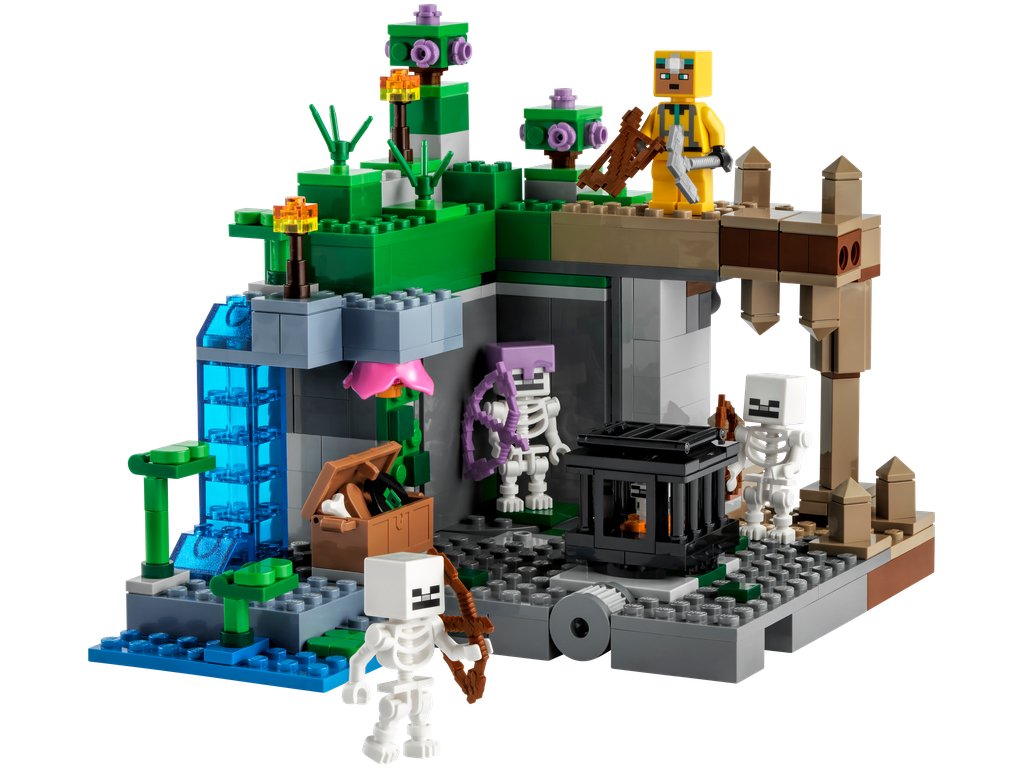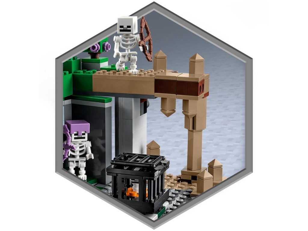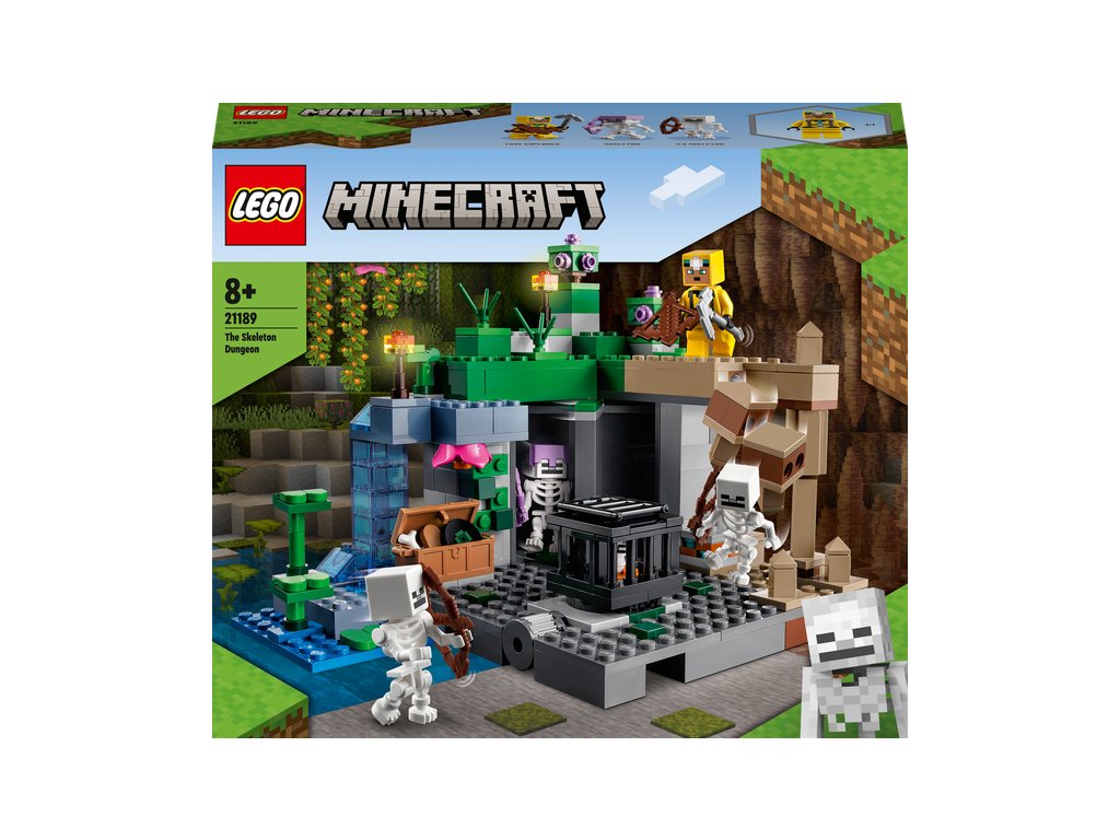 LEGO® Minecraft® Jaskyňa kostlivcov (21189) je akčná hračka pre hráčov hry Minecraft od 8 rokov. Klasické dobrodružstvá z hry Minecraft s dávkou tvorivosti LEGO V tejto všestrannej stavebnici sa jaskynný prieskumník postaví proti nepriateľským kostlivcom hneď v niekoľkých biómoch: v kvapľovej jaskyni so stalagmitmi a stalaktitmi, v bujne prerastenej jaskyni s krami, lianami, vodou, hlinou a pochodňou a v jaskyni kostlivcov, súčasťou ktorej je otáčavá funkcia zjavenia kostlivcov. A aby sa deti poriadne zabavili, posunutím stalagmitu môžu zosypať kamene na nepriateľské postavičky, prípadne otočením steny objaviť tretieho kostlivca. Nechýbajú ani zbrane, ako je kuša a krompáč, a súčasťou je aj truhlica s hudobnou platňou, chlebom a kosťou. Skrátka – všetko, čo hráč Minecraftu potrebuje na nekonečné tvorivé dobrodružstvá! Akčná stavebnica pre hráčov Minecraftu® – Súčasťou sú klasické detaily, praktické prvky