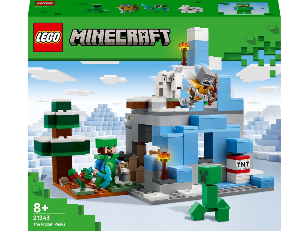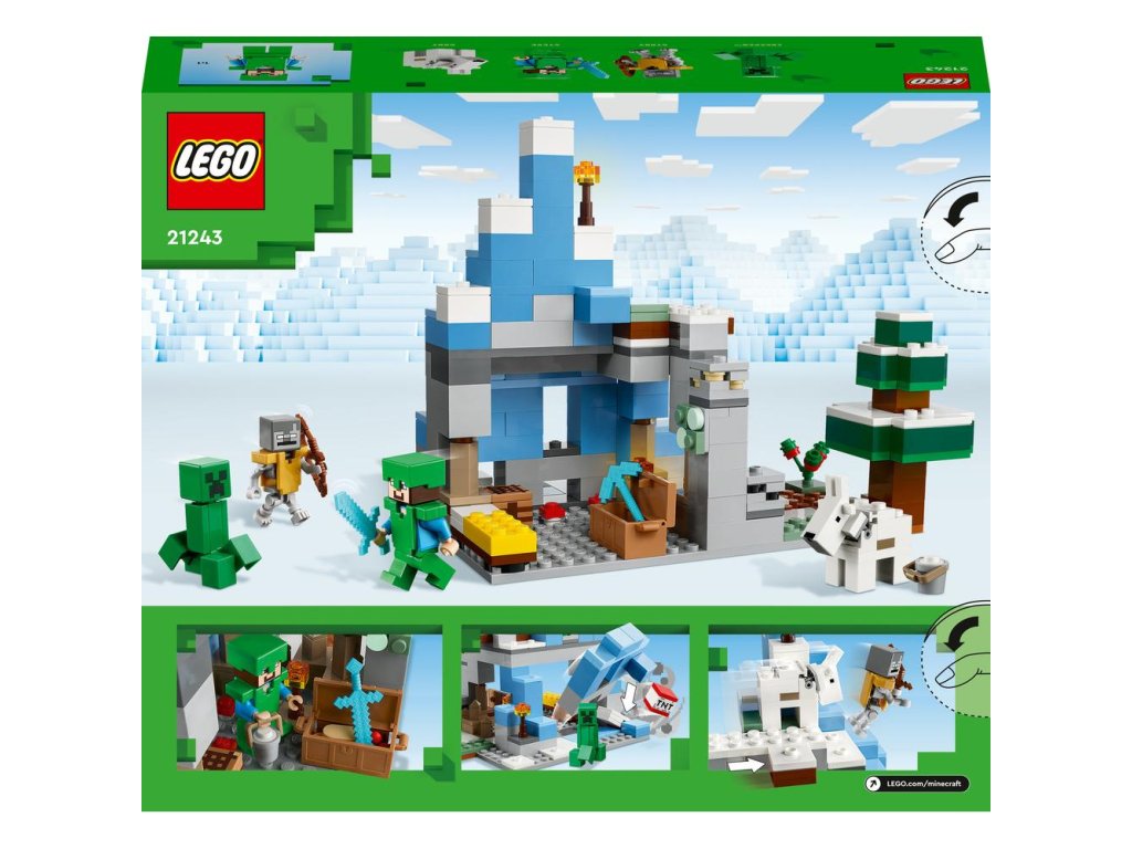 LEGO® Minecraft® Ľadové hory (21243) je stavebnica plná praktických funkcií a prvkov, s ktorou si hráči od 8 rokov užijú hory akčnej zábavy vo svete Minecraftu. Kopa stavania, súbojov, objavovania a výbuchov! Hráči Minecraftu dobre poznajú Ľadové hory a Tajgový les z hry a teraz môžu svoje zručnosti z Minecraftu využiť na dolovanie uhlia, železnej a smaragdovej rudy, ktoré sú ukryté pod ľadom. Skôr než sa však pustia dolovania, musia si postaviť úkryt a nazbierať jedlo. Keď sa známi protivníci, Creeper™ a zatúlanec, priblížia, deti môžu uniknúť skrz nebezpečnú kvapľovú jaskyňu, výbušninou odpáliť horu a vrátiť sa do úkrytu alebo kozou ich zhodiť z útesu! Rad zábavných funkcií a autentických doplnkov zaistí, aby sa dobrodružstvá z Minecraftu nikdy neskončili. Pre dávku digitálnej zábavy je k dispozícii aplikácia LEGO Builder s intuitívnymi funkciami približovania a otáčania, ktoré deťom umožňujú si