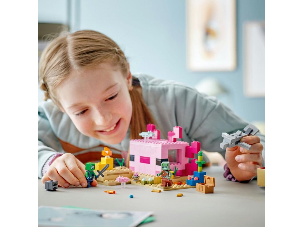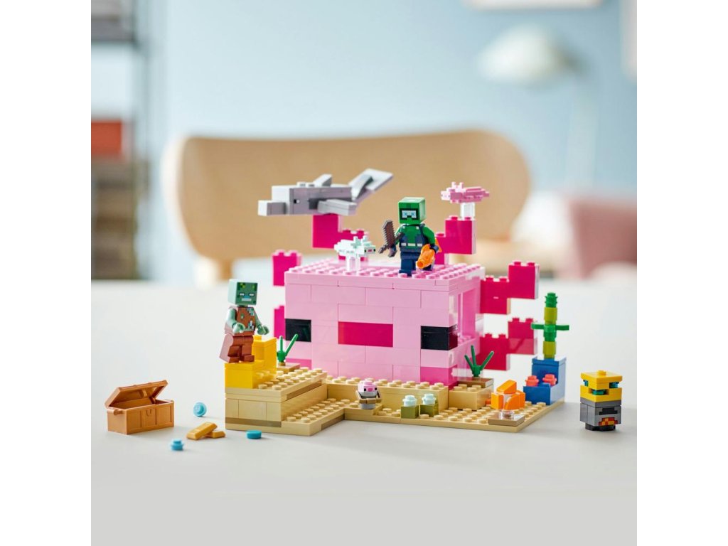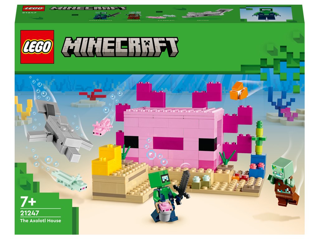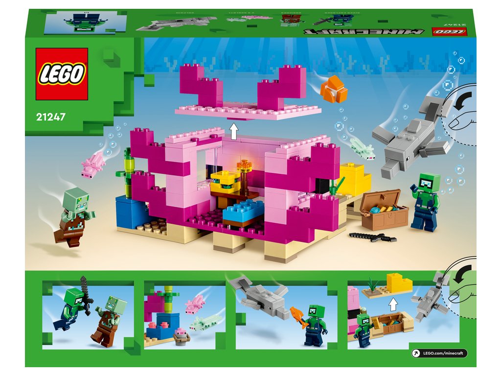 Vezmite hráčov Minecraftu na praktické dobrodružstvá pod vodou s tými najroztomilejších tvormi hry – axolotmi. Stavebnica LEGO® Minecraft Dom axolotlov (21247) pre hráčov od 7 rokov prenesie kreatívne stavanie a tvorivú akciu zo sveta Minecraftu do reality. Dobrodružstvá s roztomilými axolotmi z Minecraftu Deti môžu využiť svoje zručnosti z Minecraftu a postaviť si obrovský pestrofarebný dom v tvare obľúbeného axolotla. Následne sa môžu pridať k podmorskému prieskumníkovi a zažiť nekončiace dobrodružstvá s delfínom, ktorý hľadá poklad, štvorzubcami, 2 dospelými axolotlami, axolotlom vo vedre a skrytou truhlicou s pokladom. Odnímateľná strecha konštrukcie im umožní ľahký prístup do zariadeného interiéru s taviacou pecou a špongiou na odsávanie prípadných únikov vody. Keď však zaútočí podvodný zombie, hráči sa musia chopiť meča, pridať sa k axolotlom a ochrániť svoju hlbokomorskú základňu. Pre väčšiu dig