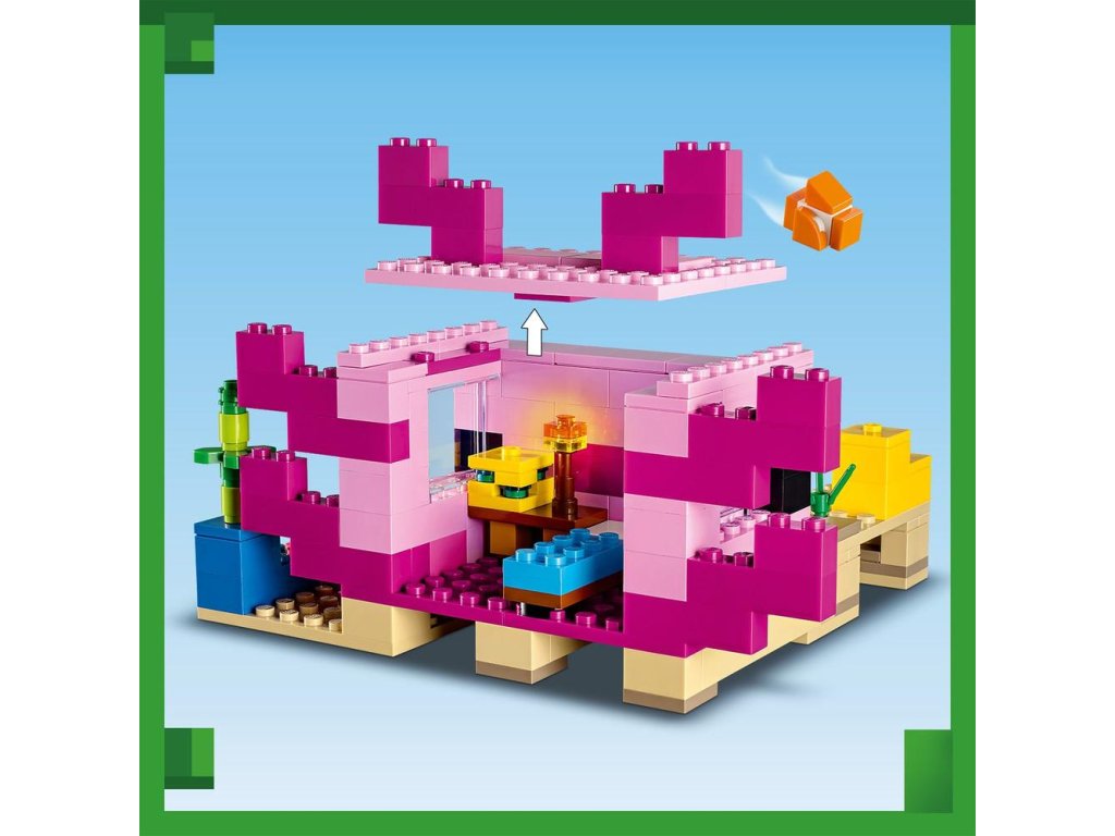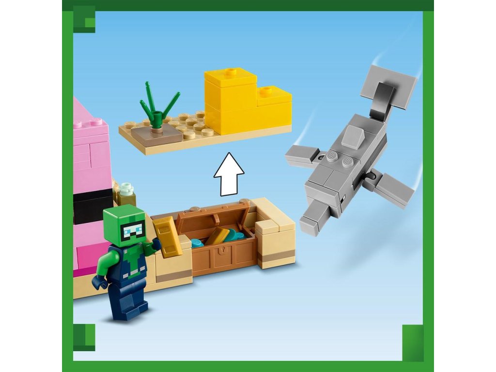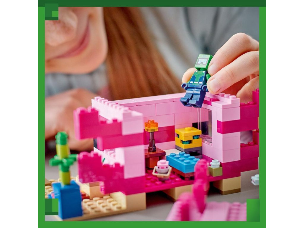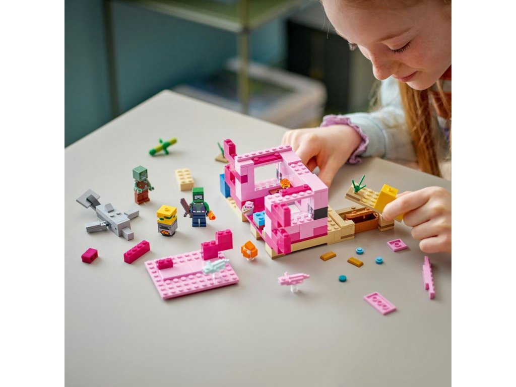 Vezmite hráčov Minecraftu na praktické dobrodružstvá pod vodou s tými najroztomilejších tvormi hry – axolotmi. Stavebnica LEGO® Minecraft Dom axolotlov (21247) pre hráčov od 7 rokov prenesie kreatívne stavanie a tvorivú akciu zo sveta Minecraftu do reality. Dobrodružstvá s roztomilými axolotmi z Minecraftu Deti môžu využiť svoje zručnosti z Minecraftu a postaviť si obrovský pestrofarebný dom v tvare obľúbeného axolotla. Následne sa môžu pridať k podmorskému prieskumníkovi a zažiť nekončiace dobrodružstvá s delfínom, ktorý hľadá poklad, štvorzubcami, 2 dospelými axolotlami, axolotlom vo vedre a skrytou truhlicou s pokladom. Odnímateľná strecha konštrukcie im umožní ľahký prístup do zariadeného interiéru s taviacou pecou a špongiou na odsávanie prípadných únikov vody. Keď však zaútočí podvodný zombie, hráči sa musia chopiť meča, pridať sa k axolotlom a ochrániť svoju hlbokomorskú základňu. Pre väčšiu dig