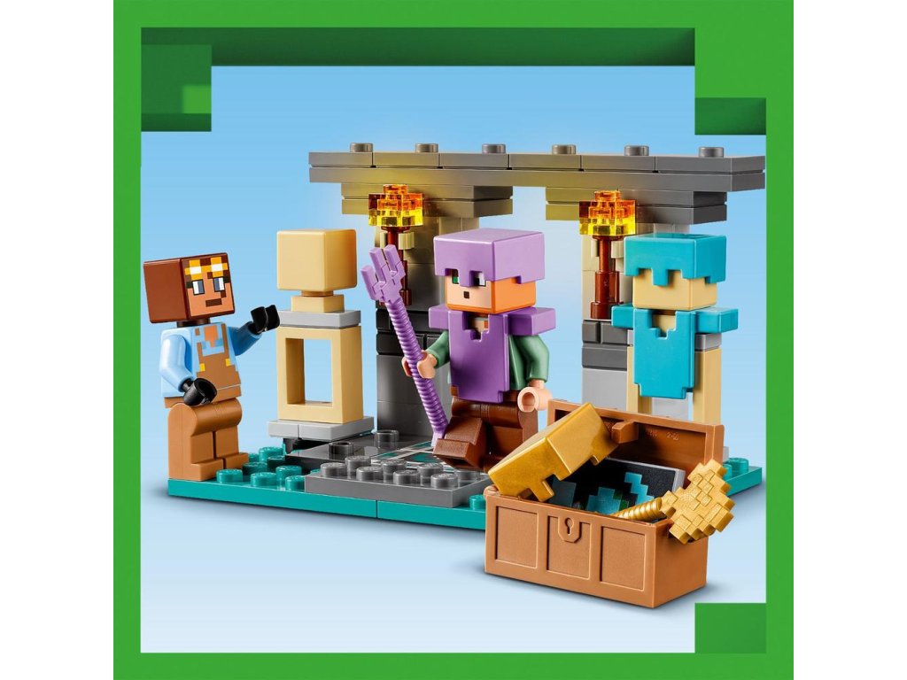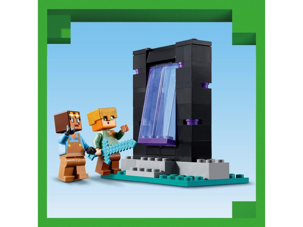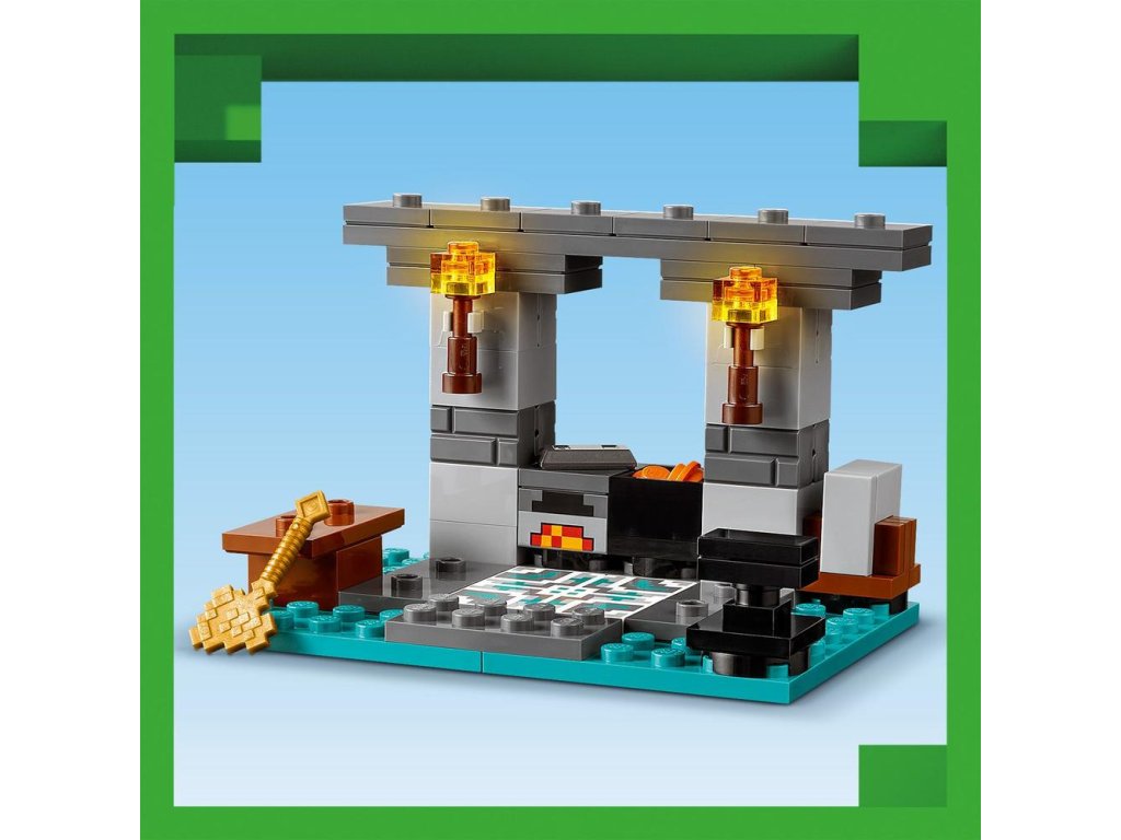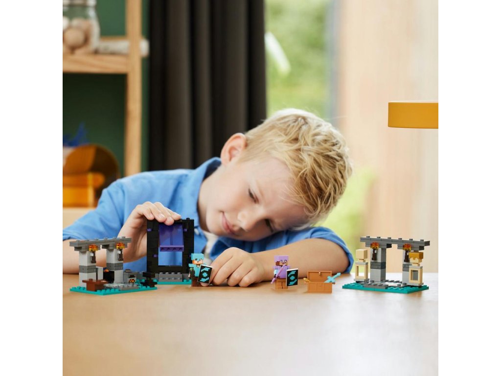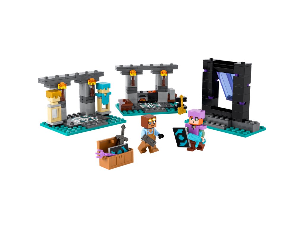 Táto zostaviteľná hračka zo sveta Minecraftu obsahuje 2 známe figúrky: Alex s jej štítom a diamantovým mečom a pracovitého Kováča brnenia. V stavebnici nájdete 3 rôzne prostredia: pracovný priestor s kovadlinou, pecou, brúsnym kameňom a kotlom naplneným lávou; miestnosť s vystaveným brnením s truhlicou obsahujúcou zlatú sekeru, zakliaty trojzubec, netheritový meč, štít a ďalšie minecraftové zdroje; a portál do Netheru s vchodom do ďalšieho dobrodružstva hráčov s hojdacími dverami. Táto dobrodružná hračka je zároveň rozširujúcou stavebnicou na hru na postavy, možno skombinovať s ostatnými stavebnicami LEGO Minecraft, najmä s modelom Prepadnutie portálu do Netheru (21255) (predávaný samostatne).