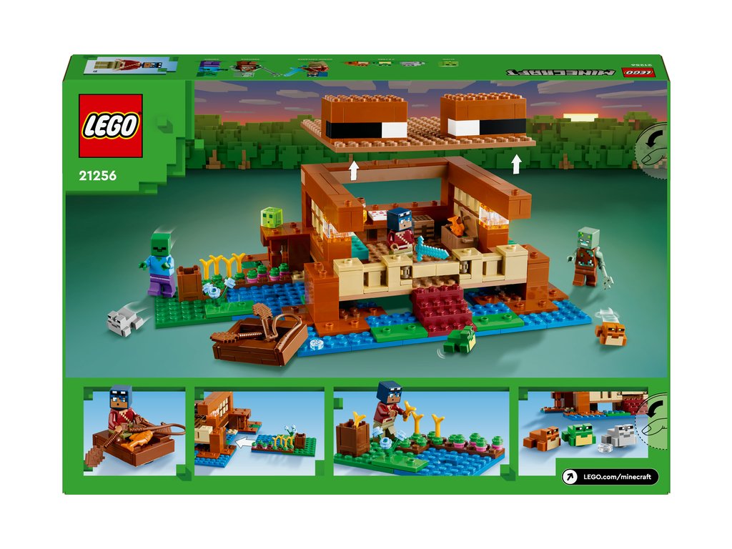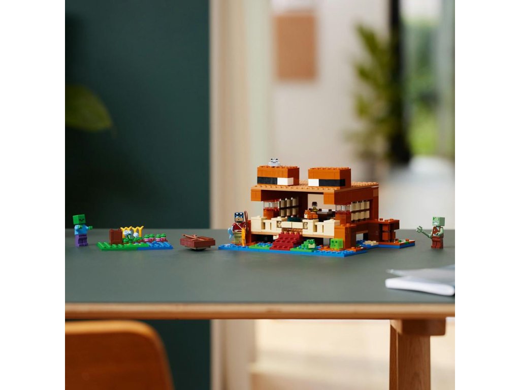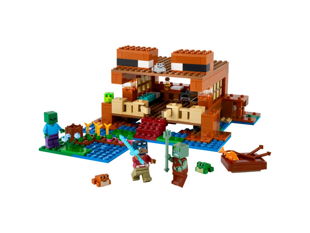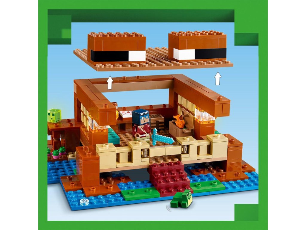 Žabí domček je stavebnicová hračka pre deti, ktoré milujú Minecraft. Domček je plný autentických detailov z Minecraftu; nájdete v ňom posteľ, stôl, pracovný stôl, pec, truhlicu, tortu a med, ako aj zdvíhaciu strechu pre ľahký prístup dovnútra. Vonku sa nachádza farma, kde môžu hráči zbierať repu, pšenicu a kvety, a jazero, kde môžu deti používať rybársky prút a plť z tmavého dubu s veslami. V stavebnici nájdete 3 druhy Žiab (zelená, sivá a hnedá) a Sliz, ktorý, ako hráči vedia, má so žabami špeciálny vzťah. Táto všestranná stavebnica LEGO® Minecraft obsahuje hrdinu z Minecraftu, zombie a utopenca s trojzubcom, takže deťom ponúka nekonečné množstvo akčnej hry a zábavy pri hre na postavy. Mladí stavatelia si obľúbia aj aplikáciu LEGO Builder, ktorá im umožňuje približovať a otáčať svoje stavebnice v 3D rozhraní a sledovať svoj pokrok.