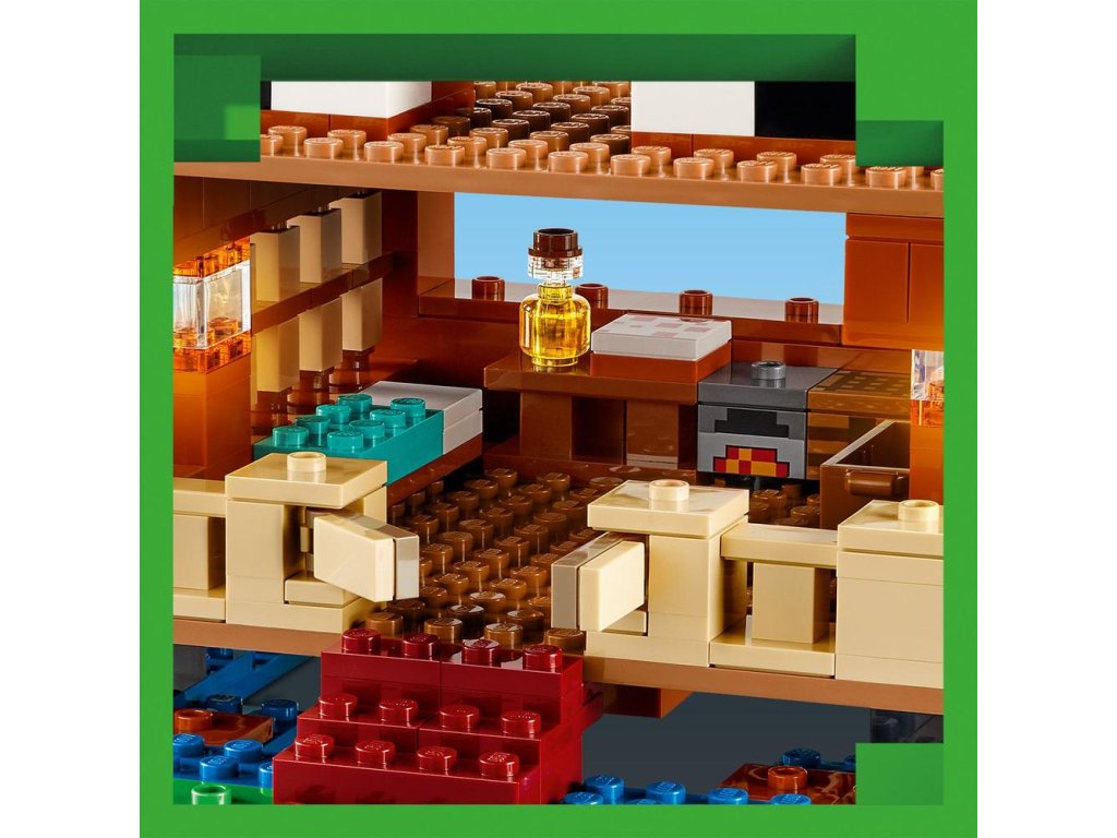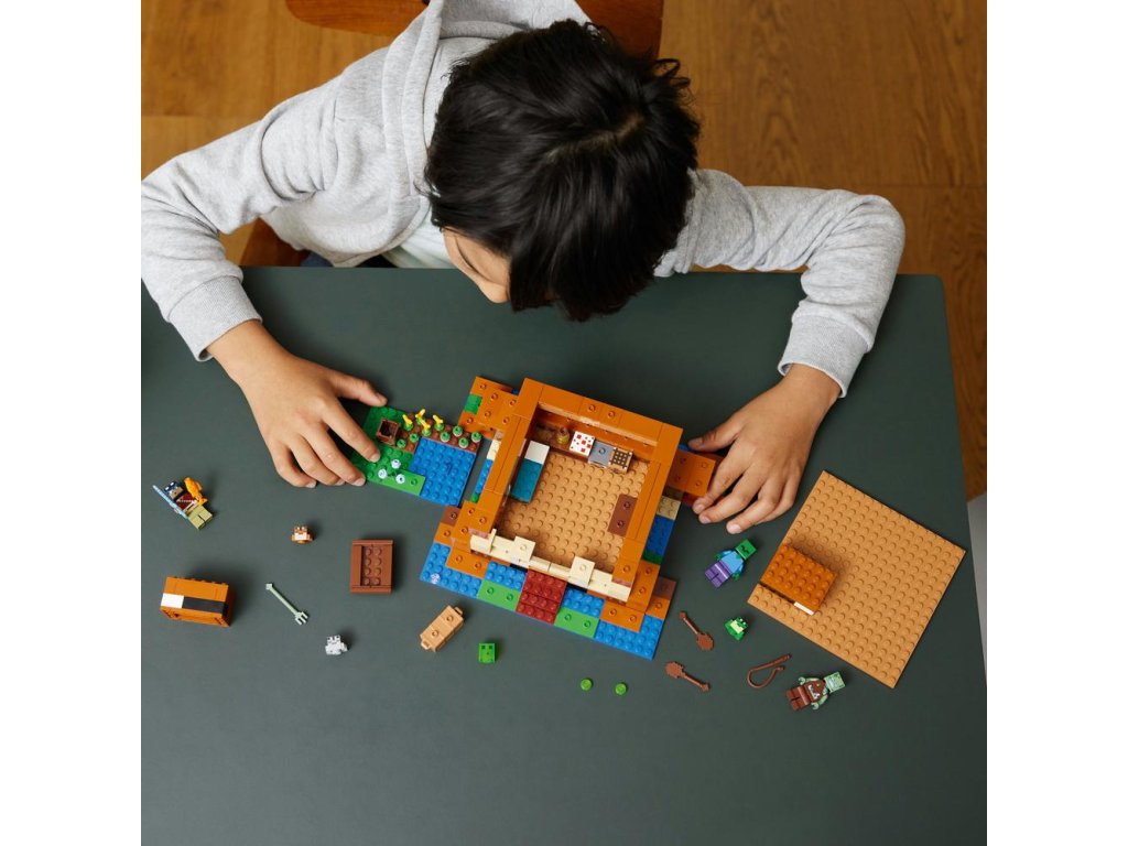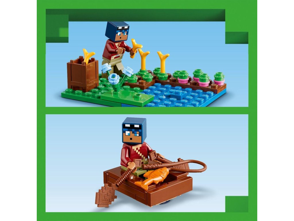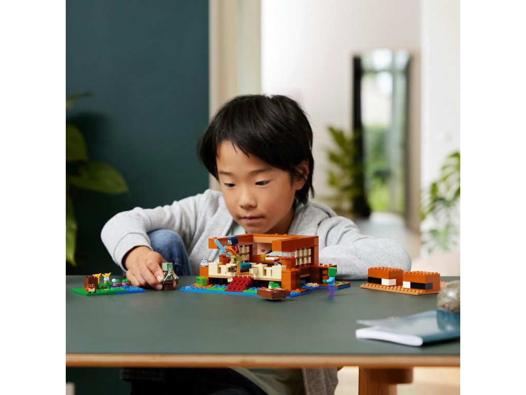 Žabí domček je stavebnicová hračka pre deti, ktoré milujú Minecraft. Domček je plný autentických detailov z Minecraftu; nájdete v ňom posteľ, stôl, pracovný stôl, pec, truhlicu, tortu a med, ako aj zdvíhaciu strechu pre ľahký prístup dovnútra. Vonku sa nachádza farma, kde môžu hráči zbierať repu, pšenicu a kvety, a jazero, kde môžu deti používať rybársky prút a plť z tmavého dubu s veslami. V stavebnici nájdete 3 druhy Žiab (zelená, sivá a hnedá) a Sliz, ktorý, ako hráči vedia, má so žabami špeciálny vzťah. Táto všestranná stavebnica LEGO® Minecraft obsahuje hrdinu z Minecraftu, zombie a utopenca s trojzubcom, takže deťom ponúka nekonečné množstvo akčnej hry a zábavy pri hre na postavy. Mladí stavatelia si obľúbia aj aplikáciu LEGO Builder, ktorá im umožňuje približovať a otáčať svoje stavebnice v 3D rozhraní a sledovať svoj pokrok.