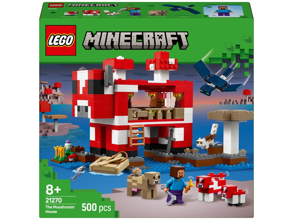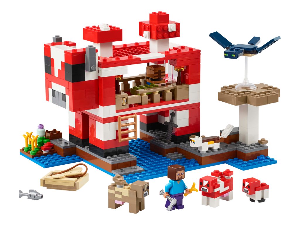 Tento hračkársky domček zo série LEGO Minecraft sa nachádza na hubovom ostrove a nájdete v ňom postavy obľúbeného Steva, červenú kravotrávku, malú červenú kravotrávku, hnedú kravotrávku, trojfarebnú mačku a nepriateľský lietajúci prízrak. Stavebnica je plná prvkov, ktoré poznáte z hry, vrátane malej farmy s pšenicou, hubami a mäsožravej rastliny rastúcej vedľa kompostéra. Medzi doplnky patrí rybársky prút, treska, motyka, netheritový meč, miska, čln s veslami, truhlica, pec, remeselný stôl, polička s knihami, chlieb a posteľ. Aplikácia LEGO Builder poskytuje deťom ešte viac zábavy a vďaka svojmu zariadeniu si tak môžu približovať a otáčať modely v 3D rozhraní.