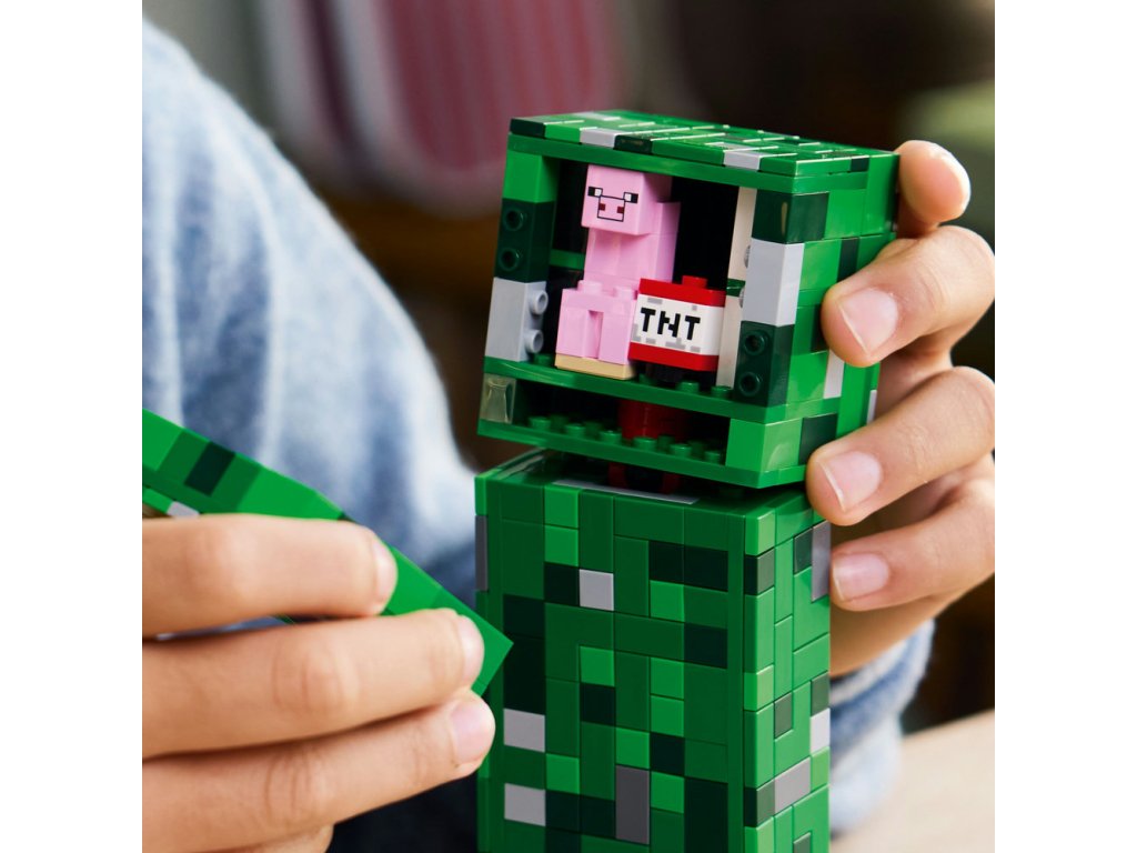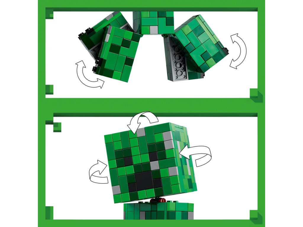 - Skryté prekvapenie – Nadvihnite prednú časť hlavy Creepera LEGO® Minecraft® a odhaľte vnútro s prvou verziou minifigúrky Creepera a prvkom TNT
