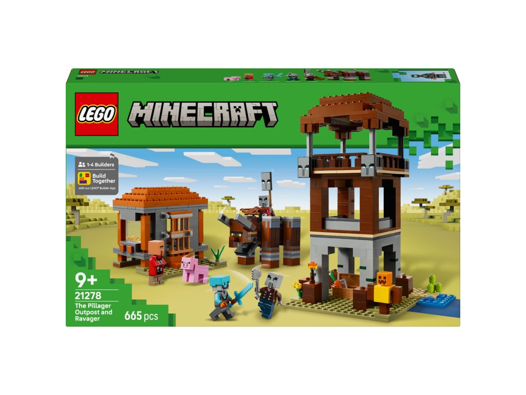 Základňa plieniteľov a Ničiteľ (21278) bude skvelým darčekom pre deti, ktoré majú radi hravé stavebnice, dobrodružstvá zo série LEGO® Minecraft alebo dekorácie do svojho herného kútika. Táto kvalitná hračka dá hráčom od 9 rokov do rúk poriadnu zábavu z Minecraftu. Stavebnica obsahuje 4 minifigúrky LEGO Minecraft: Vesmírneho strážcu, Kapitána útoku, murára-dedinčana a Pomstiteľa. Zostaviteľná figúrka Ničiteľa má ovládaciu páčku, ktorou môžu deti hýbať figúrku, praskať jeho sánku a narážať hlavou do všetkého navôkol. Strážna veža obsahuje rebríky na prístup do troch poschodí, zástavy s tvárami plieniteľov a truhlicu so vzácnym pokladom. Murársky dom má otváracie dvere a zariadený interiér s posteľou a kamenárskou pílou. Nechýba tu ani figúrka prasaťa LEGO Minecraft a doplnky vrátane cvičnej figuríny, baterky, mrkvy, železného ingota, diamantovej prilby, diamantového meča, kuše a železnej sekery. Apli