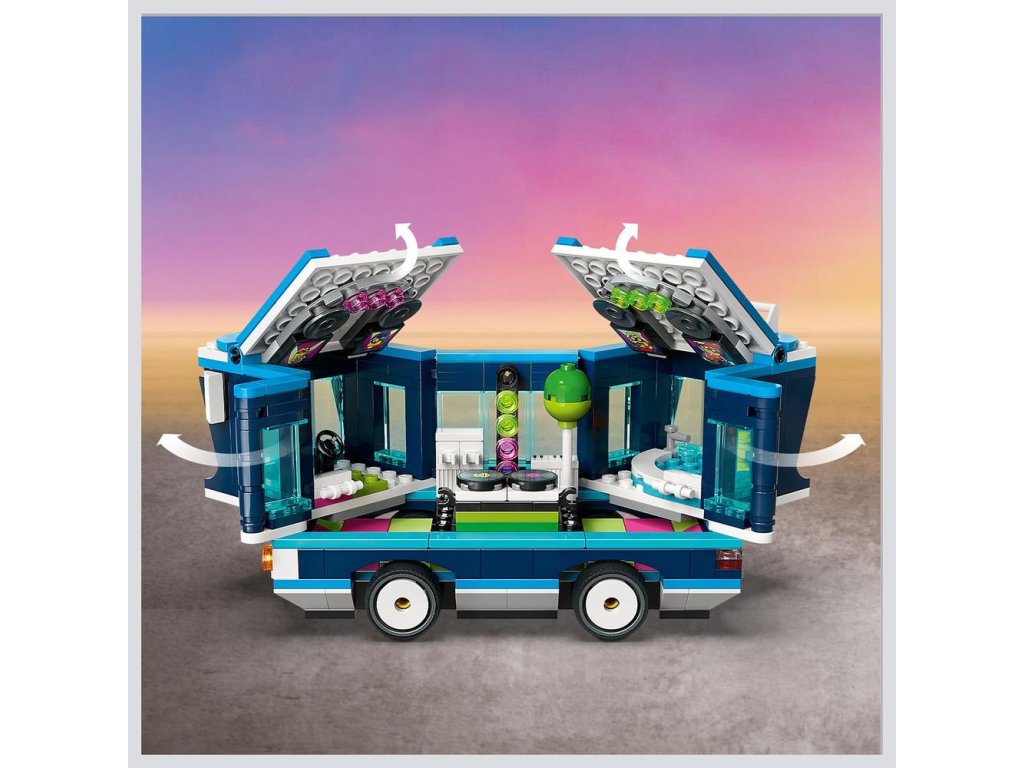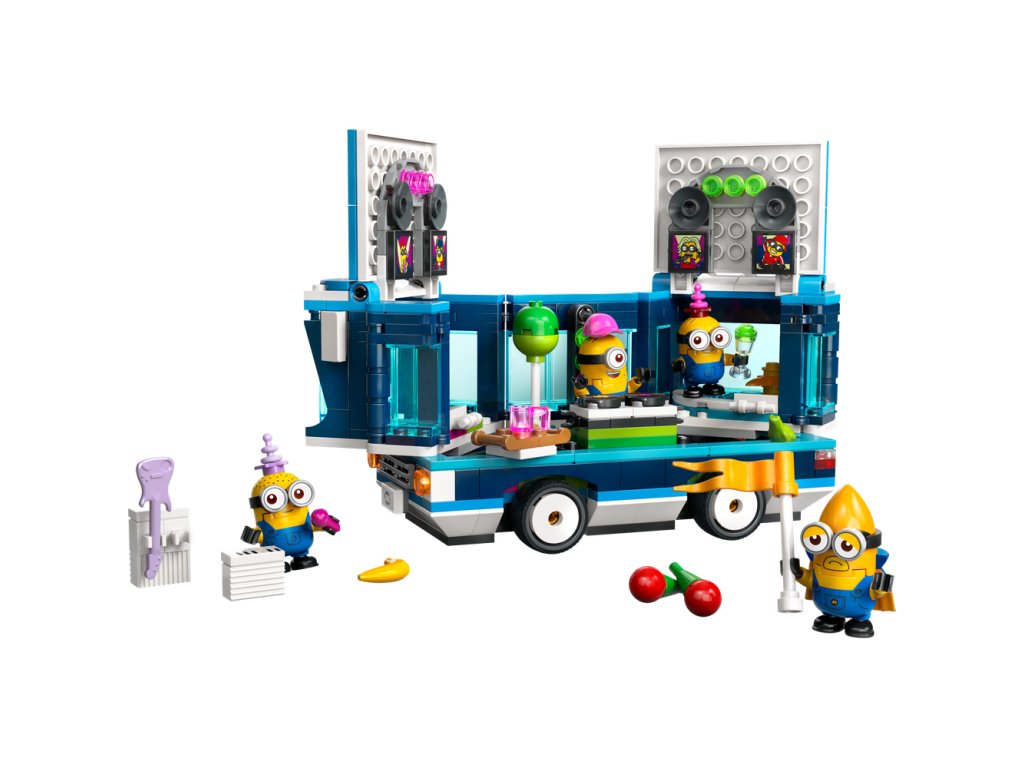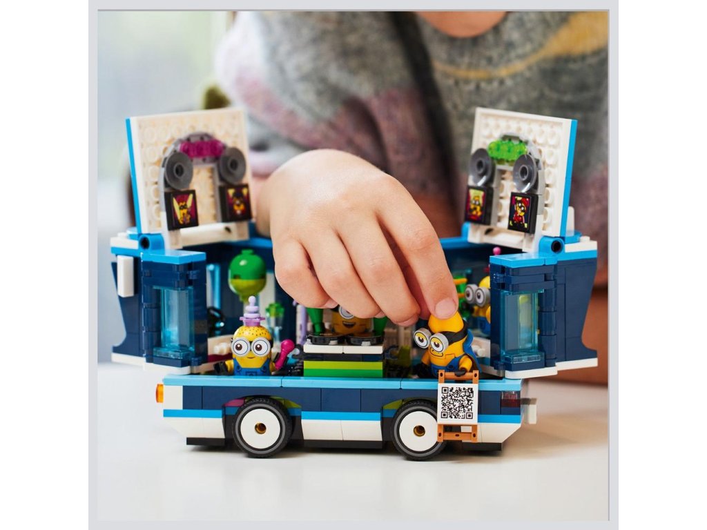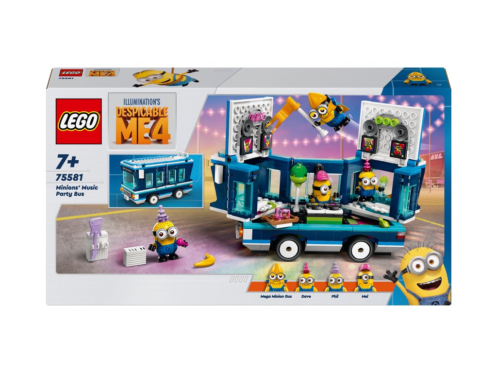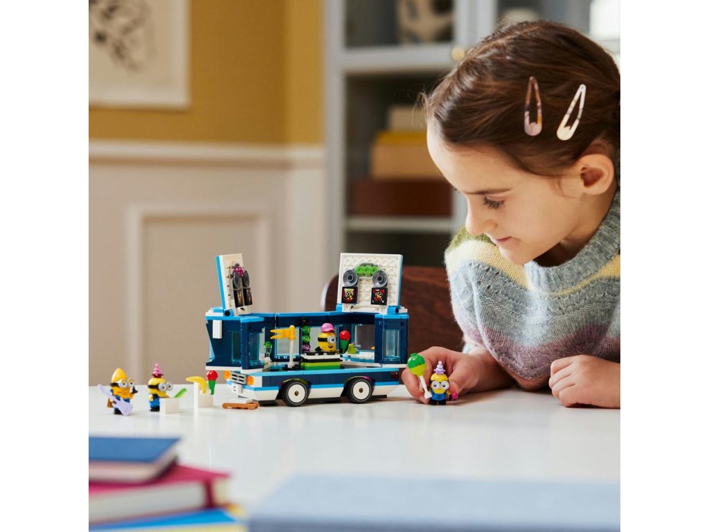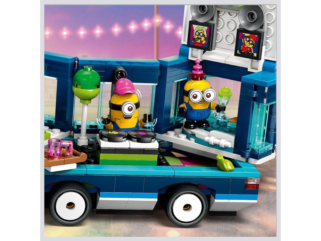 Stavebnica obsahuje 4 figúrky Mimoňov: Phila, Mel, Davea a lietajúceho Mega Mimoňa Gusa, ktorý sa prvýkrát objavil vo filme Ja, zloduch 4. V autobuse nájdete sedadlo vodiča aj tyč na streche, na ktorú sa Gus môže zavesiť. Autobus môžete otvoriť z jednej strany a takisto možno nadvihnúť strechu, čím odhalíte tanečný parket, DJ pult, elektrickú gitaru, klavír, mikrofón, svetlá, reproduktory a vírivku! Mnohé prvky sa dajú odpojiť a rozšíriť tak herné možnosti aj mimo autobusu. Táto zábavná hračka hýri pestrými farbami a parádnymi doplnkami vrátane vlajky, balóna, zmrzliny, klobúkov, nápojov, svetiel, reproduktorov a obrazoviek. Ešte viac digitálnej zábavy si deti užijú v aplikácii LEGO Builder.