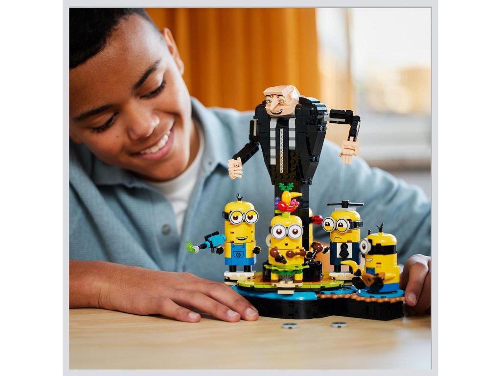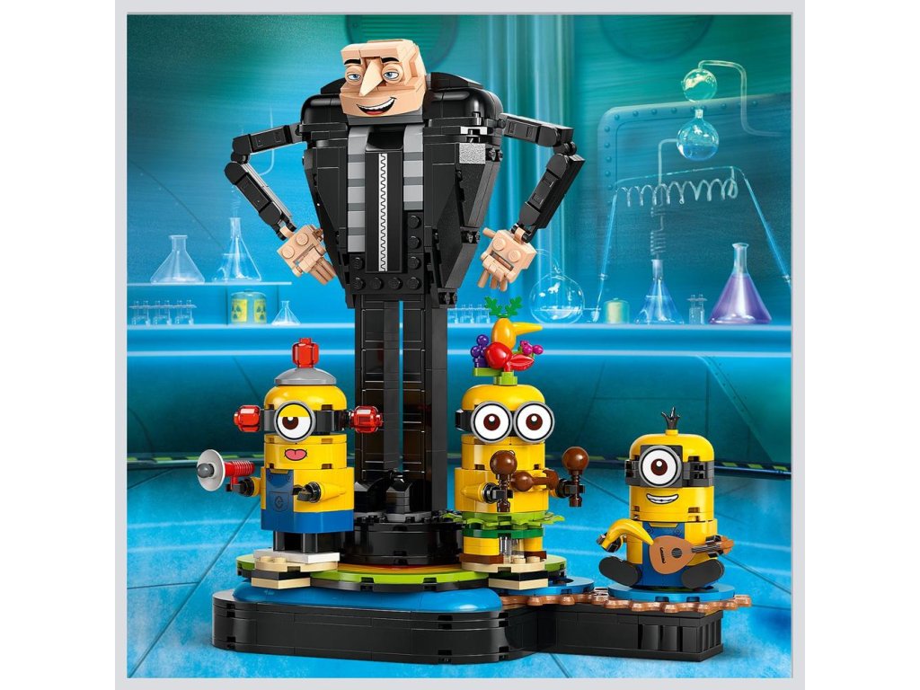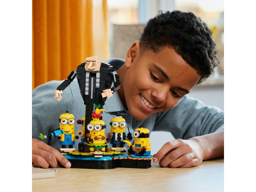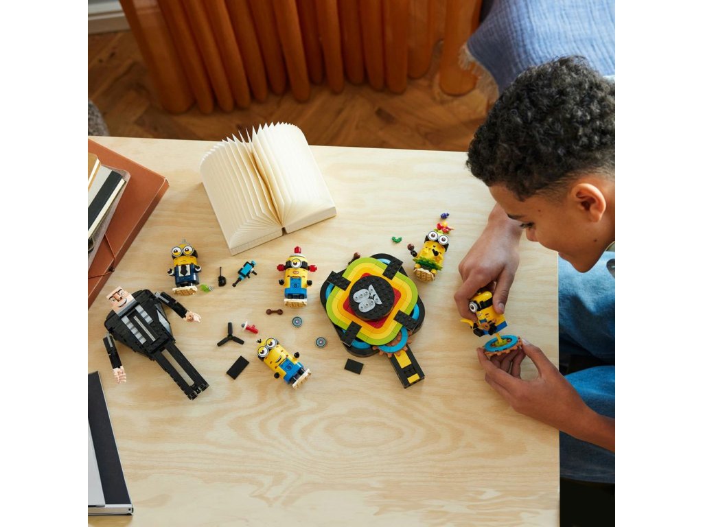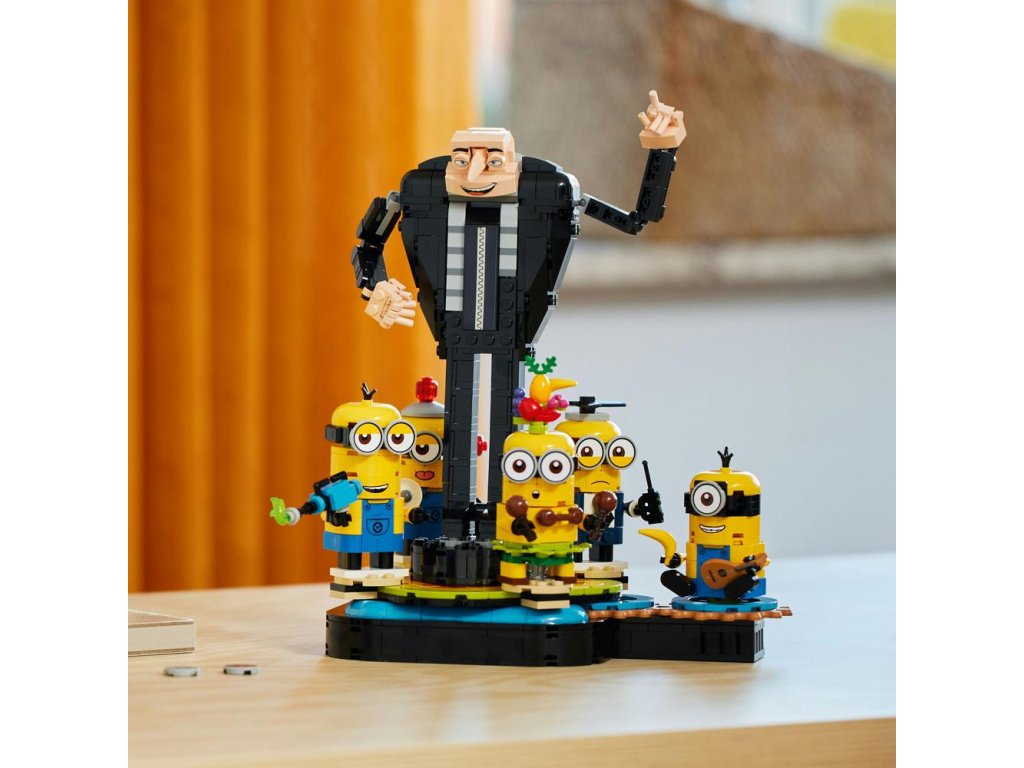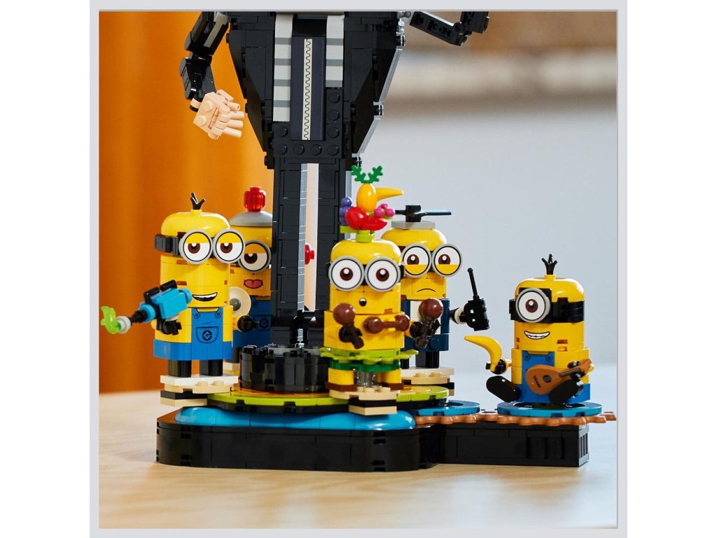 Veľká figúrka Grua má pohyblivé ramená, ruky a prsty, ktoré môžu deti nastaviť do obľúbených póz. V modeli nájdete 5 zostaviteľných postavičiek Mimoňov: Jerry s rumba guľami a ovocným klobúkom, tajný agent Dave s vrtuľou na hlave a vysielačkou, Mimoň Beedoo s megafónom, Mel hrajúci na ukulele a Kevin so svojou prdiacou pištoľou. Mimoňi sú umiestnení na otočnej doske, a keď deti otočia sediaceho Mimoňa, ostatní Mimoňi začnú tancovať okolo svojho usmievavého šéfa! Každý Mimoň vie hýbať rukami a držať v nich rôzne doplnky. Ich hlavy sú pohyblivé a ich oči môžete vymeniť a vytvoriť tak rôzne výrazy. 4 Mimoňov môžete zložiť zo stojana a preskúmať ďalšie možnosti hry.