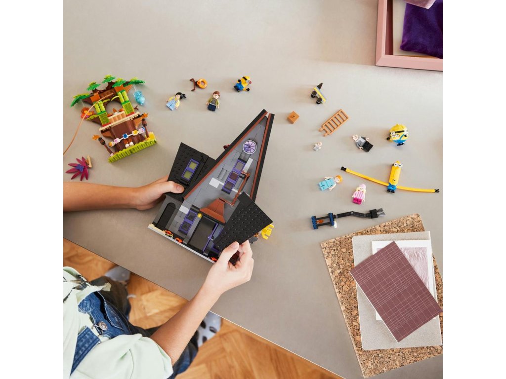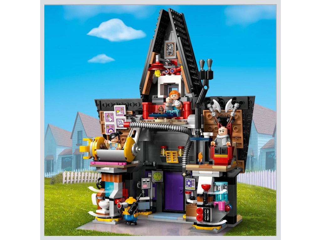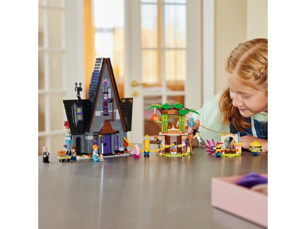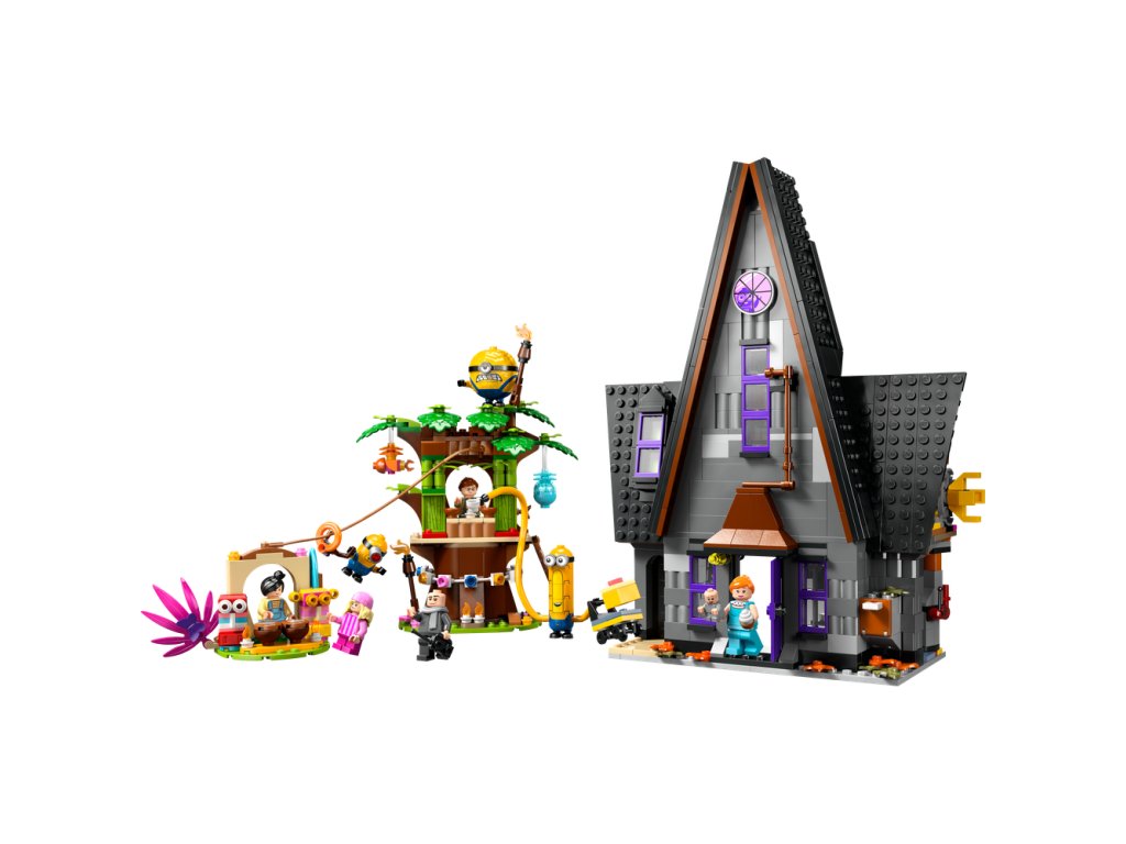 Gruov kultový dom obsahuje známe prvky z filmu vrátane červeného gauča, krbu, spálne v štýle rakety, laboratória Mimoňov s nástrojmi a otočnými jednotkami z predmetmi, ako je toaleta a box na sušienky. Vedľa domu sa nachádza pestrofarebný domček na strome, ktorý obsahuje jedálenský kút s lanovou dráhou nadol do priestoru na párty (s bongami!) a vyzdobený úkryt pod plošinou s kvetmi, hračkami a sviečkami. Súčasťou je 6 minifigúrok – Gru, Lucy, Margo, Edith, Agnesa Baby – a 3 veľké zostaviteľné figúrky Mimoňov Mel, Jerryho a Tima. Táto stavebnica je plná zábavných prekvapení a s jej mnohými postavičkami a doplnkami je ideálnym mimoňským darčekom pre deti.