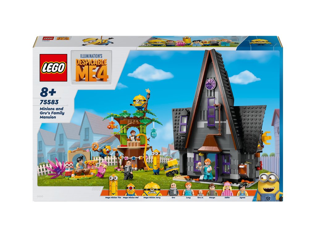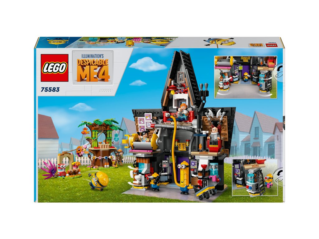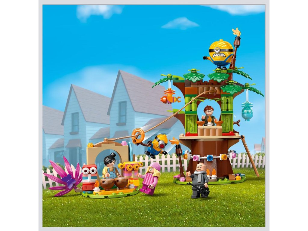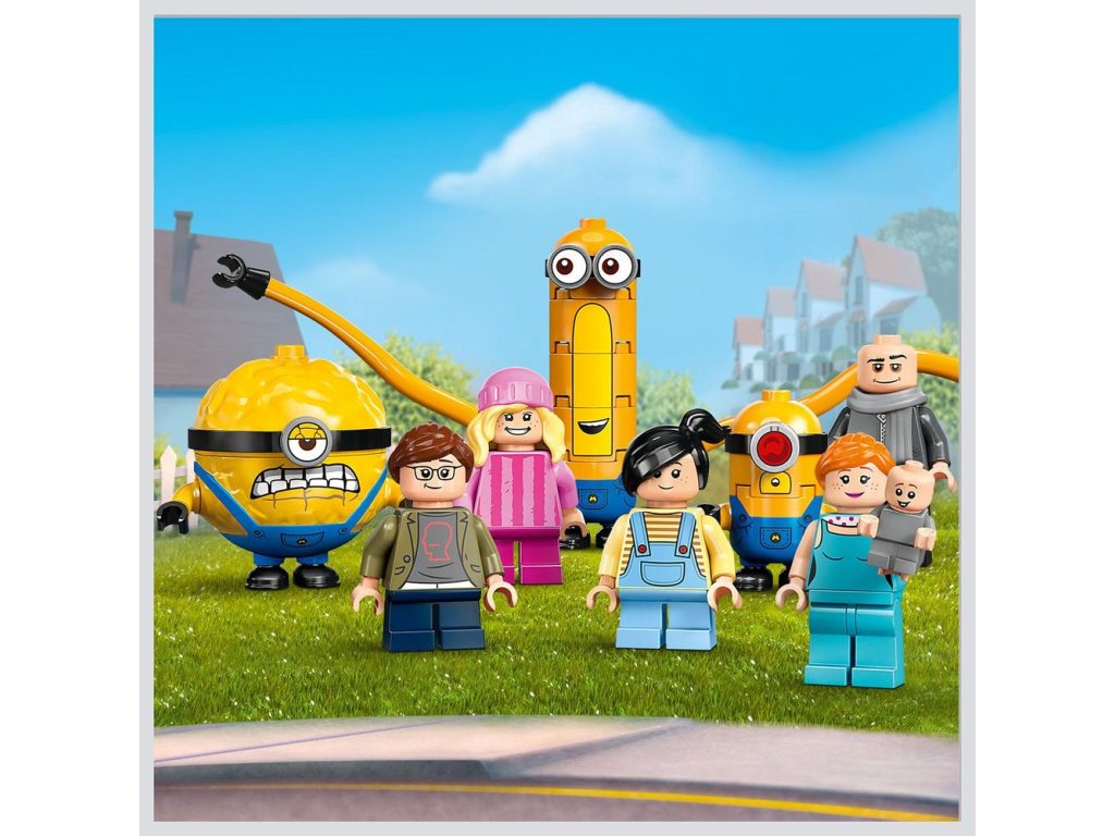 Gruov kultový dom obsahuje známe prvky z filmu vrátane červeného gauča, krbu, spálne v štýle rakety, laboratória Mimoňov s nástrojmi a otočnými jednotkami z predmetmi, ako je toaleta a box na sušienky. Vedľa domu sa nachádza pestrofarebný domček na strome, ktorý obsahuje jedálenský kút s lanovou dráhou nadol do priestoru na párty (s bongami!) a vyzdobený úkryt pod plošinou s kvetmi, hračkami a sviečkami. Súčasťou je 6 minifigúrok – Gru, Lucy, Margo, Edith, Agnesa Baby – a 3 veľké zostaviteľné figúrky Mimoňov Mel, Jerryho a Tima. Táto stavebnica je plná zábavných prekvapení a s jej mnohými postavičkami a doplnkami je ideálnym mimoňským darčekom pre deti.