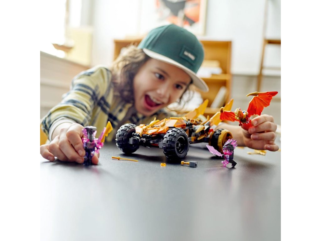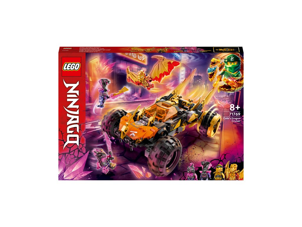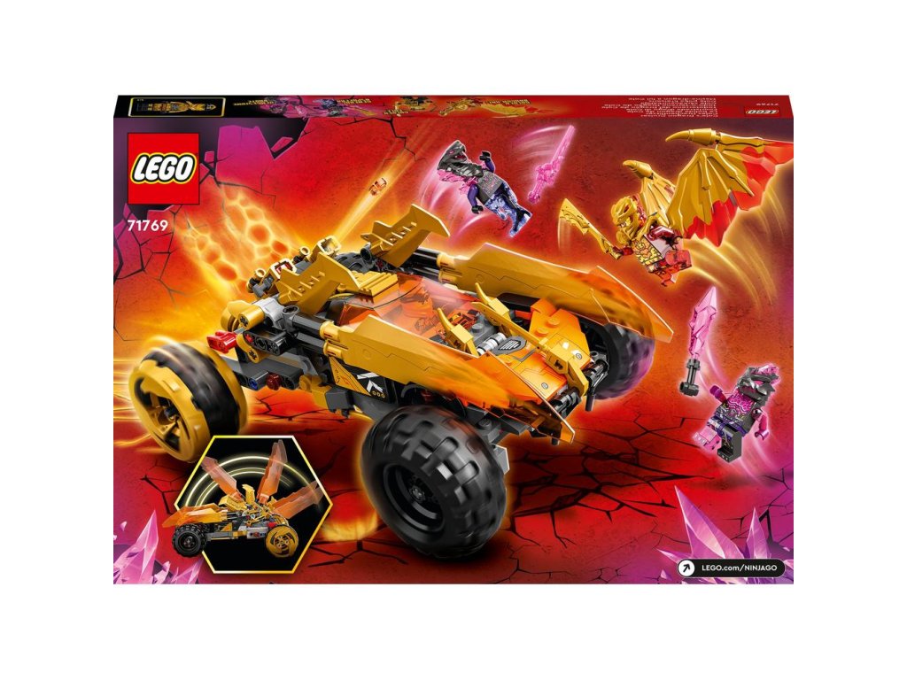 Stavebnica LEGO® NINJAGO® Coleovo dračie vozidlo (71769) deťom od 8 rokov umožňuje zinscenovať si zábavné scény zo seriálu NINJAGO: Crystallized. Nindža vozidlo má pôsobivé zlaté bleskové čepele, ktoré možno zatlačiť vpred do režimu dračieho útoku, 2 vystreľovače projektilov, 4 veľké pneumatiky a miesto pre šoféra a pasažiera, kam možno posadiť minifigúrky. Dokonalá stavebnica, ktorá v deťoch prebudí túžbu po nindžovskej akcii Táto stavebnica NINJAGO vozidla sa dodáva so 4 minifigúrkami: zlatým dračím Kaiom s jeho živelnou zbraňou a zlatými dračími krídlami zdobenými ostňami, zlatým Coleom, haďou generálkou Aspheerou, ktorá je vyzbrojená krištáľovou zbraňou, a pomstivou príšerou s mečom. Štýlové hračky pre malého nindžu Hračky NINJAGO deti prenesú do napínavého sveta fantazijnej akcie, kde spoja sily s Coleom, Kaiom, Nyou a skupinou nindžov v boji proti nebezpečným zloduchom a zahrajú sa na dobrod
