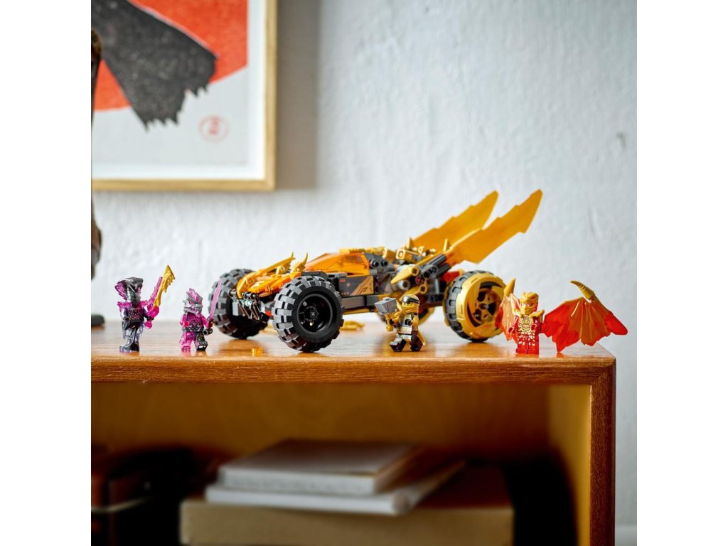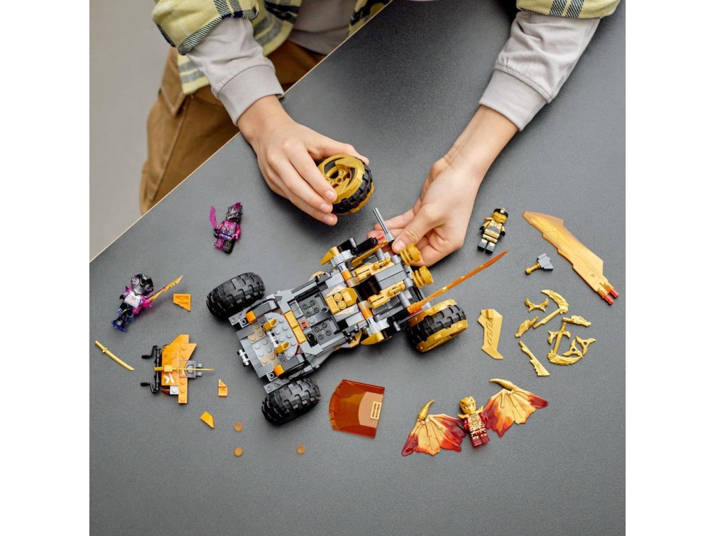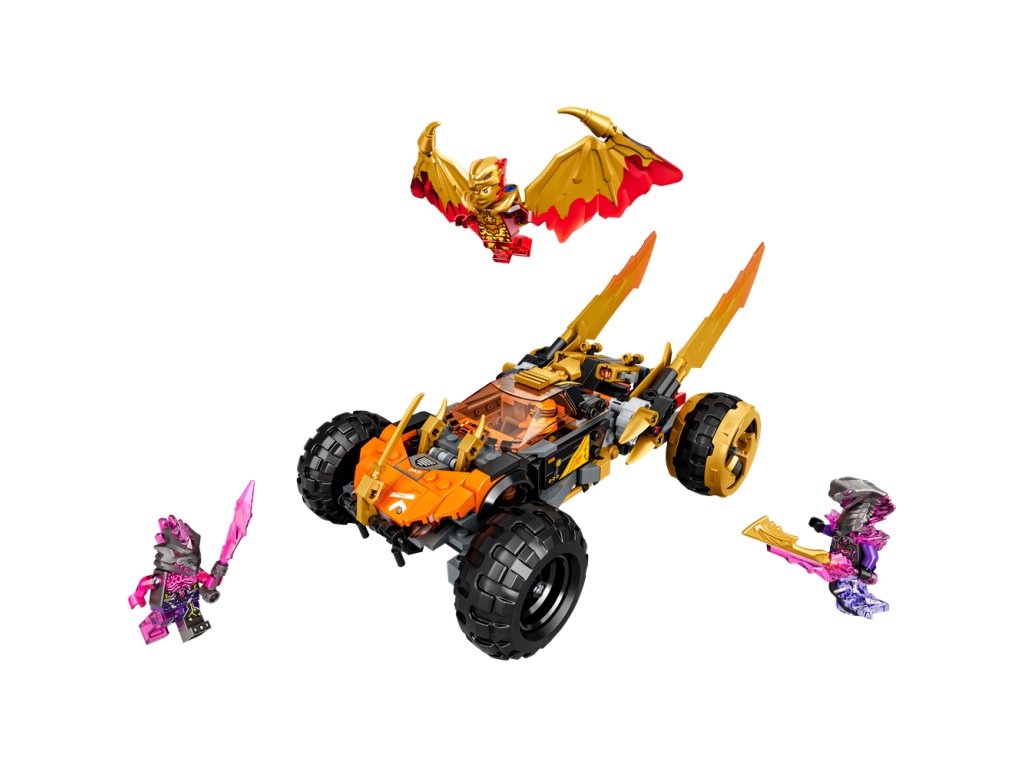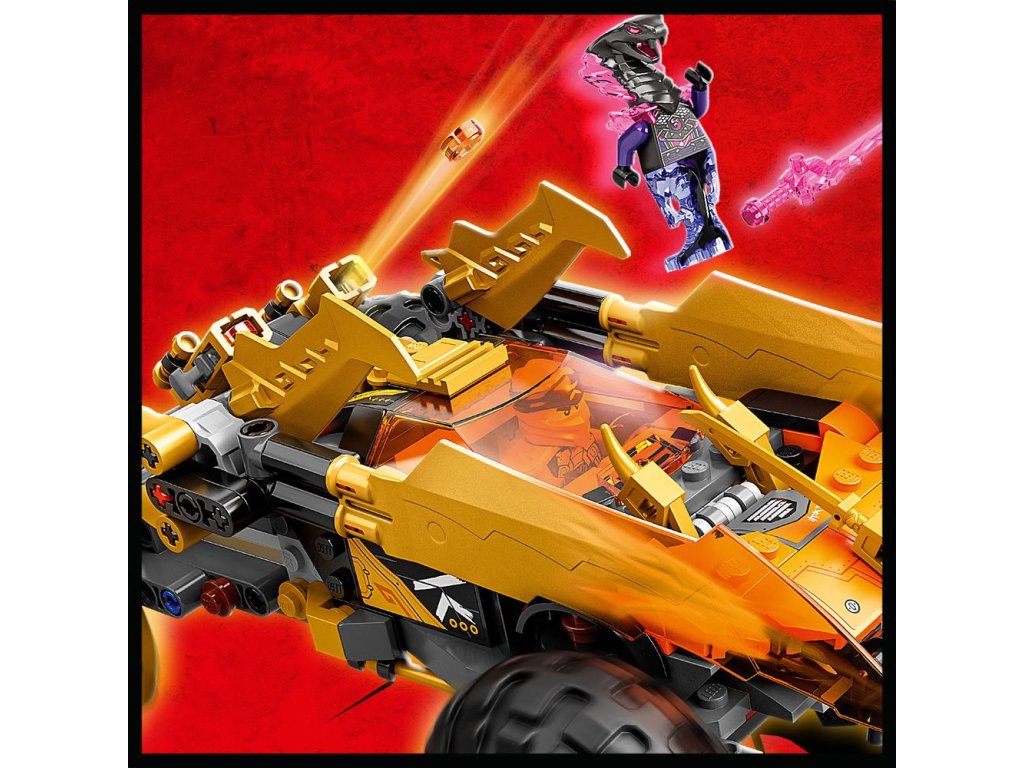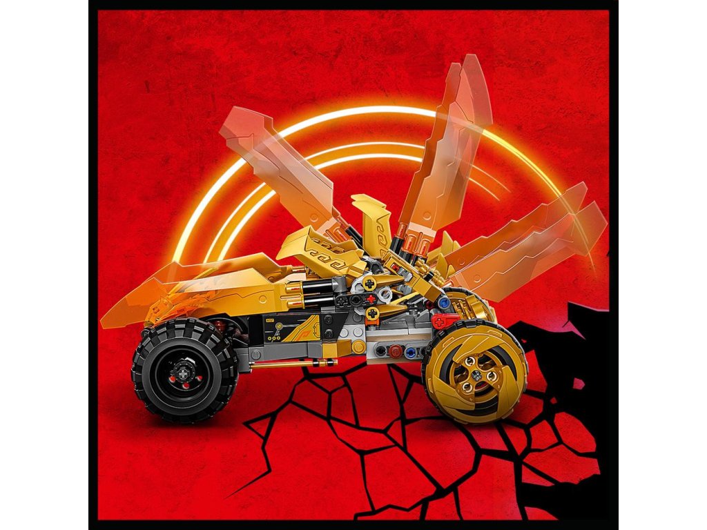 - Vozidlo NINJAGO® –Vozidlo je vybavené 4 veľkými pneumatikami, zlatými bleskovými čepeľami, ktoré možno stlačiť vpred do režimu dračieho útoku, 2 vystreľovačmi projektilov a sedadiel pre minifigúrky