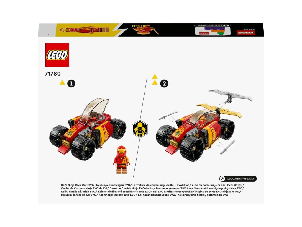 Dajte fanúšikom nindžov od 6 rokov možnosť okúsiť vzrušenie z jazdy s touto stavebnicou Kaiovo nindžovské pretekárske auto EVO (71780). Toto auto zo série LEGO® NINJAGO® má otvárací kokpit a pôsobivý zlatý spojler vzadu. Výmenou jeho 4 kolies ho môžete transformovať z terénneho vozidla na pouličné pretekárske auto. Tie najlepšie nindža hračky pre deti Stavebnica sa dodáva s fantastickou minifigúrkou Kaia vyzbrojeného 2 zlatými katanami, ktorého môžete posadiť do parádneho červeného auta NINJAGO. Inšpiruje deti užívať si nekonečné hodiny pretekárskej akcie po uliciach mesta NINJAGO. Zábavný digitálny zážitok pre fanúšikov LEGO Vás aj vaše dieťa teraz staviteľským zážitkom intuitívnym spôsobom prevedie aplikácia LEGO Builder. Približujte a otáčajte modely v 3D prostredí, ukladajte si stavebnice a sledujte postup stavania.