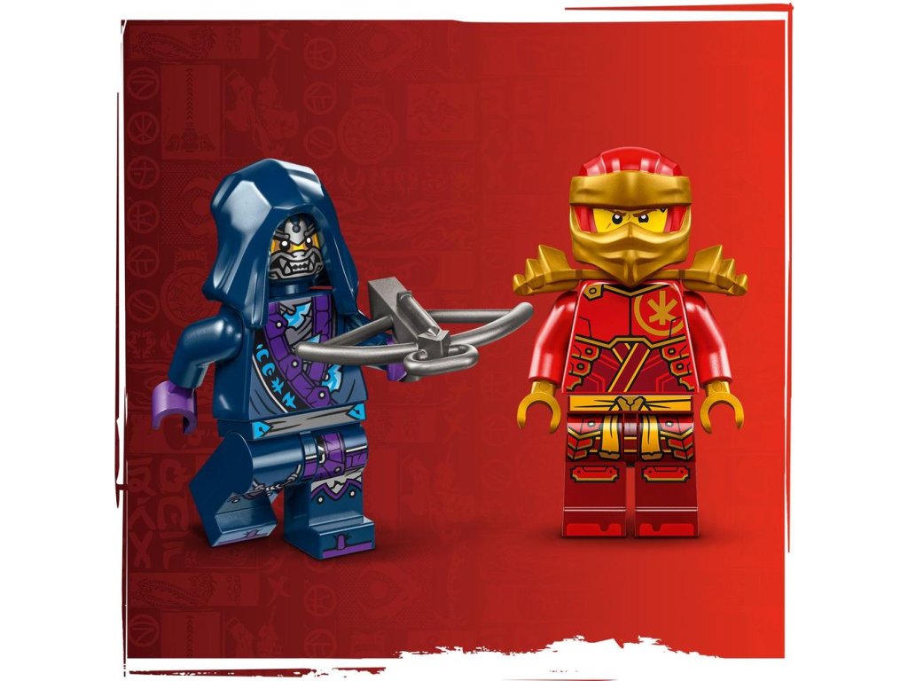 Táto stavebnica sa dodáva s 2 minifigúrkami: Drak Kai s mečom katana, ktorý jazdí na zostaviteľnej figúrke draka, a Strážca vo vlčej maske s doplnkom kuše. Deti si môžu zinscenovať súboje medzi týmito postavičkami LEGO NINJAGO o modrý prvok dračej sily z polohovateľných úst akčnej figúrky draka.