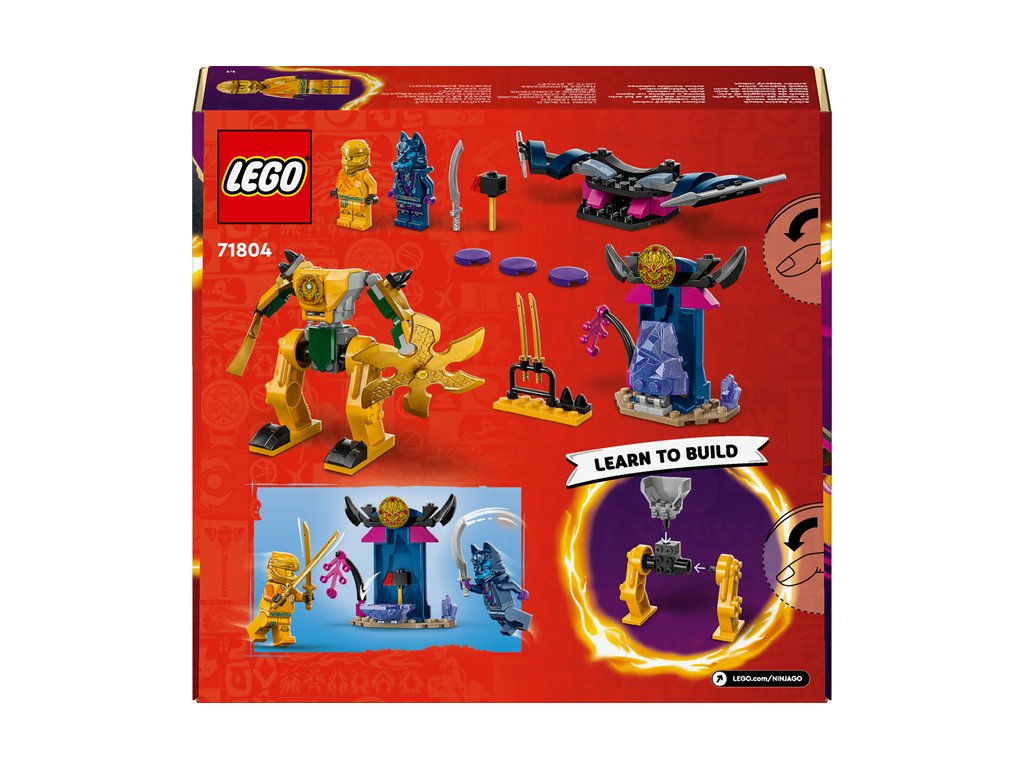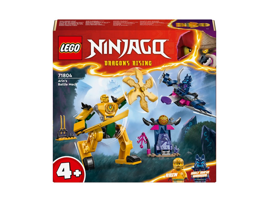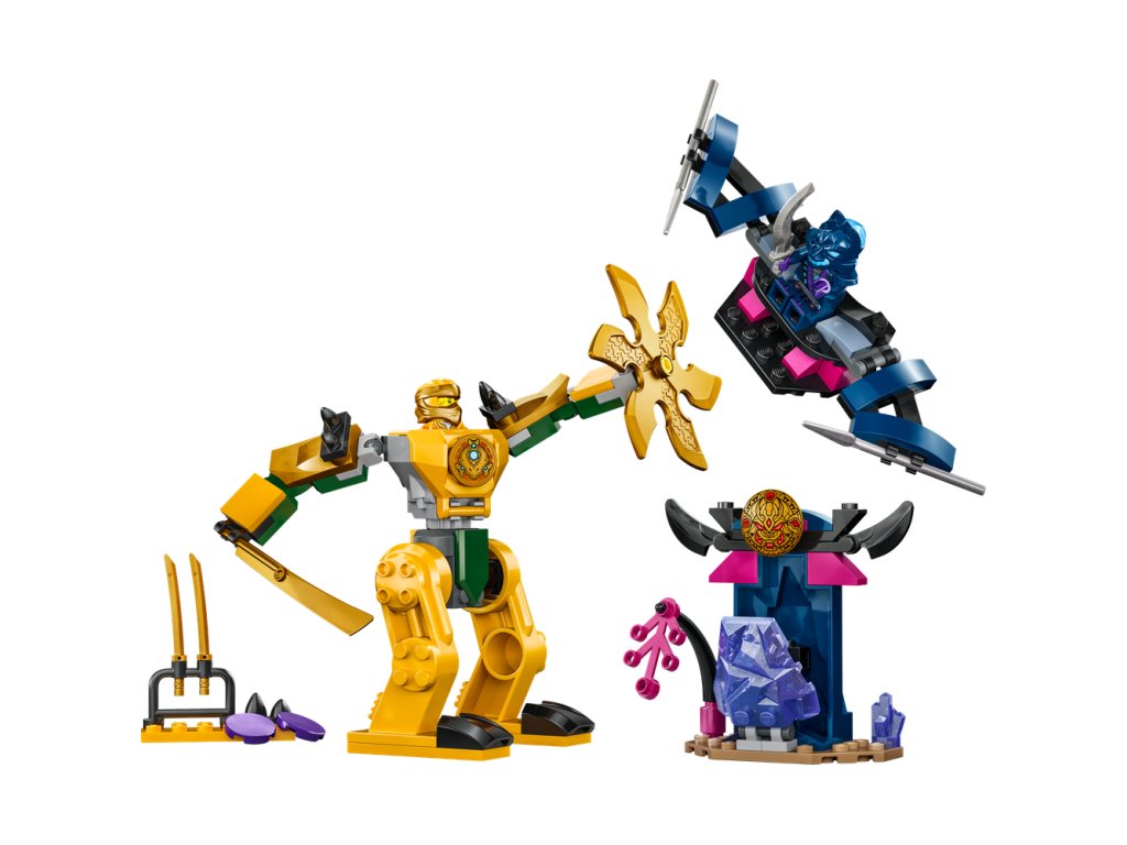Táto stavebnica LEGO® obsahuje 2 minifigúrky: Arina s prvkom katany a Bojovníka vo vlčej maske s prvkom meča. Arin sa zmestí do figúrky polohovateľného robota, ktorý má v ruke veľký meč a rotujúcu čepeľ, zatiaľ čo Bojovník vo vlčej maske môže lietať vo vznášadle s polohovateľnými krídlami, vystreľovačom diskov a 2 oštepmi. K dispozícii je aj kryštálová jaskyňa z kociek s paličkou roztrieštenia vo vnútri a stojan na zbrane s 2 zlatými prvkami mečov katana.