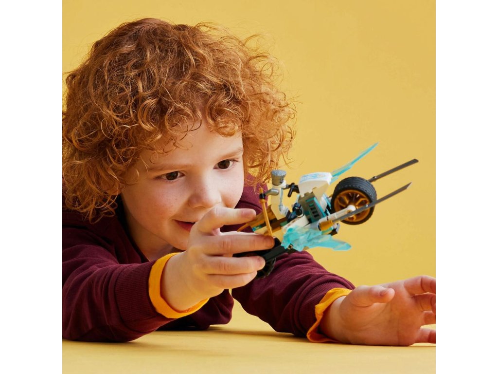 LEGO® NINJAGO Zaneova ľadová motorka (71816) umožňuje chlapcom a dievčatám od 7 rokov zahrať si rýchlu akciu z 2. série televízneho seriálu NINJAGO Dragons Rising ®. Táto nindžovská hračka pre deti obsahuje motorku NINJAGO s pohyblivými kolesami, zlatými čepeľami a odpružením na zadnej pneumatike. Keď deti stlačia pneumatiku, parádne ľadové čepele sa na oboch stranách rozložia do režimu útoku.