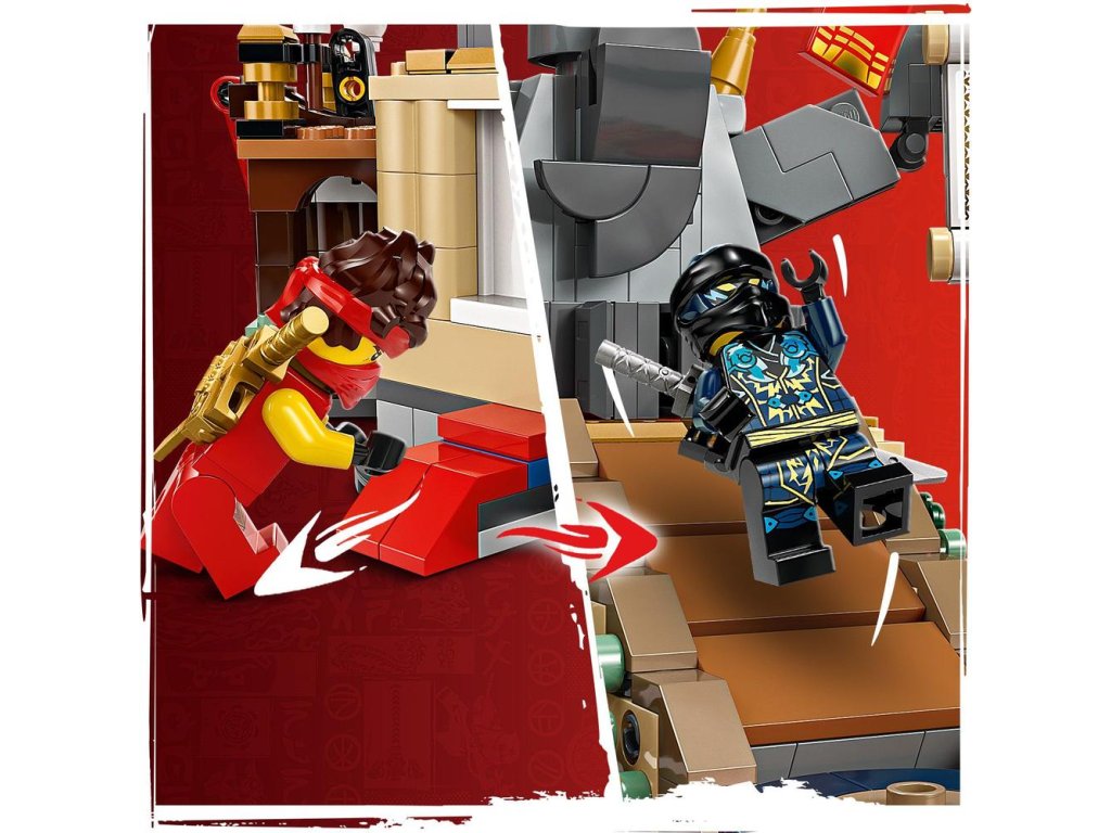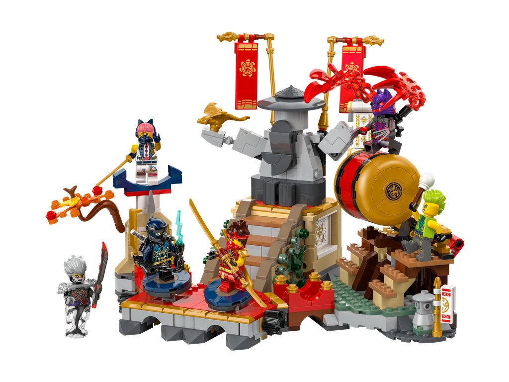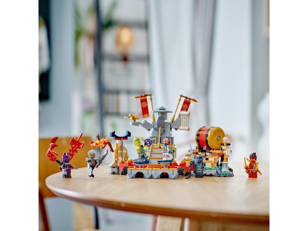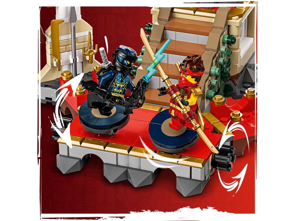 Táto stavebnica zo série LEGO® NINJAGO obsahuje 2 pohyblivé plošiny, ktoré môžu zahrať napínavý súboj medzi nindžom a zloduchom, veľký bubon, ktorý odtlačí zo stojana smerom a môže odkotviť do arény, schodisko, ktoré sa zrúti pomocou páky a všetkých tímov spadnú na zem.