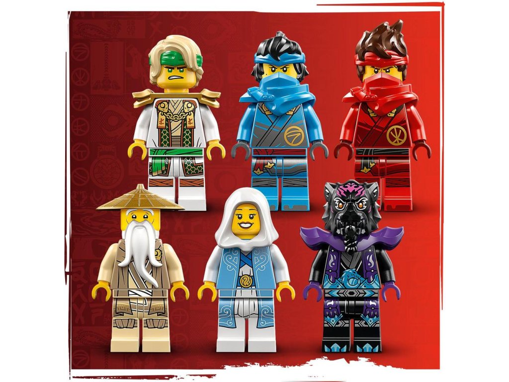 Tento zostaviteľný model sa dodáva tak 6 minifigúrkami NINJAGO: Majster Lloyd s doplnkom palice, Majster Wu s doplnkom kopije, Nya s 2 doplnkami meča katana a párom nindžovských bojových vidlíc sai, Kai s 2 doplnkami meč katana a mečom, Euphrasia s doplnkom. kladivom. Deti tak k dispozícii všetko, čo budú potrebovať na zinscenovanie napínavých nindžovských bitiek.