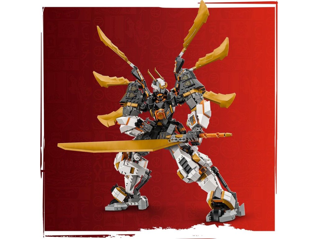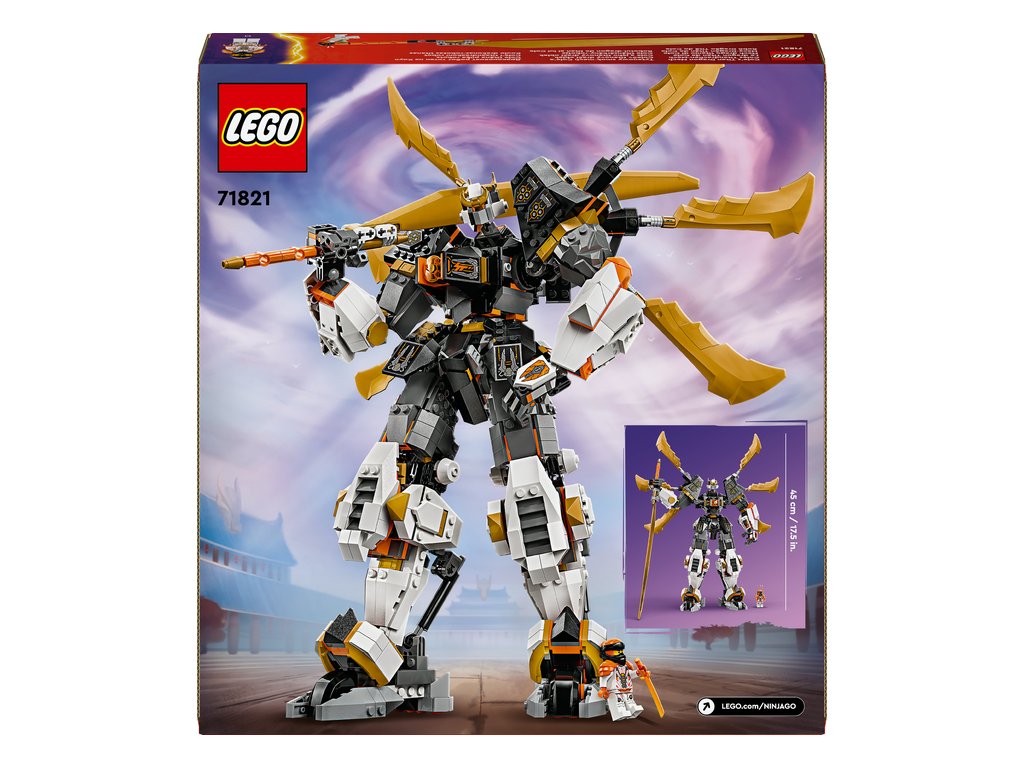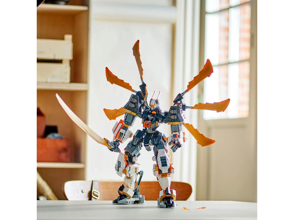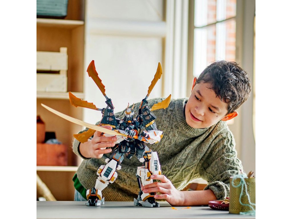 Dobrodružná hračka Cole a jeho titanový dračí oblek (71821) umožní chlapcom a dievčatám od 12 rokov zahrať sa na akčné scény z 2. série televízneho seriálu NINJAGO® Dragons Rising. Tento model je najväčší titanový robotický oblek zo série NINJAGO a má polohovateľné ruky, nohy, hlavu, telo, ohybné body a kĺby, takže ho deti môžu nasmerovať do bojových póz. Model sa takisto dodáva s párom polohovateľných krídel a veľkým mečom.
