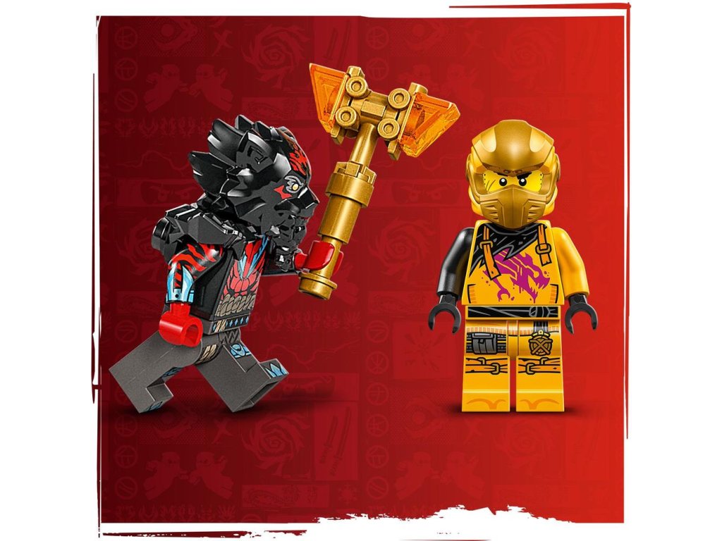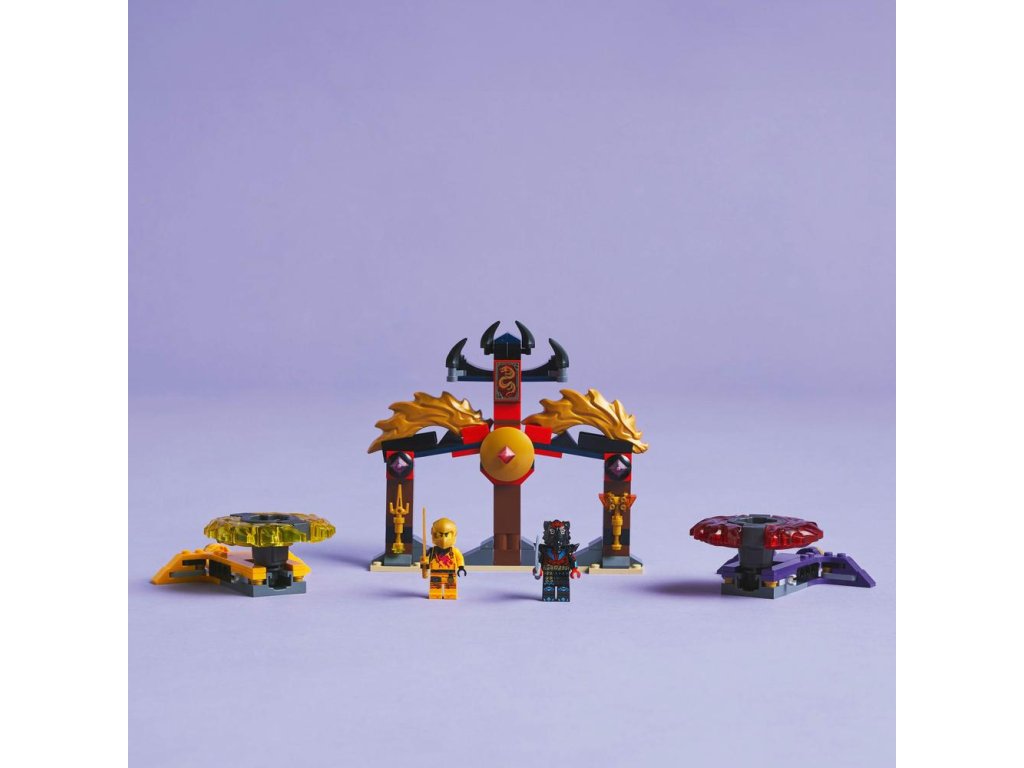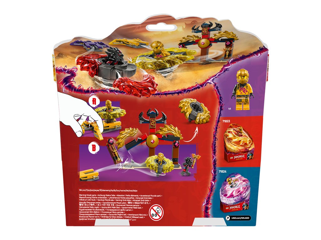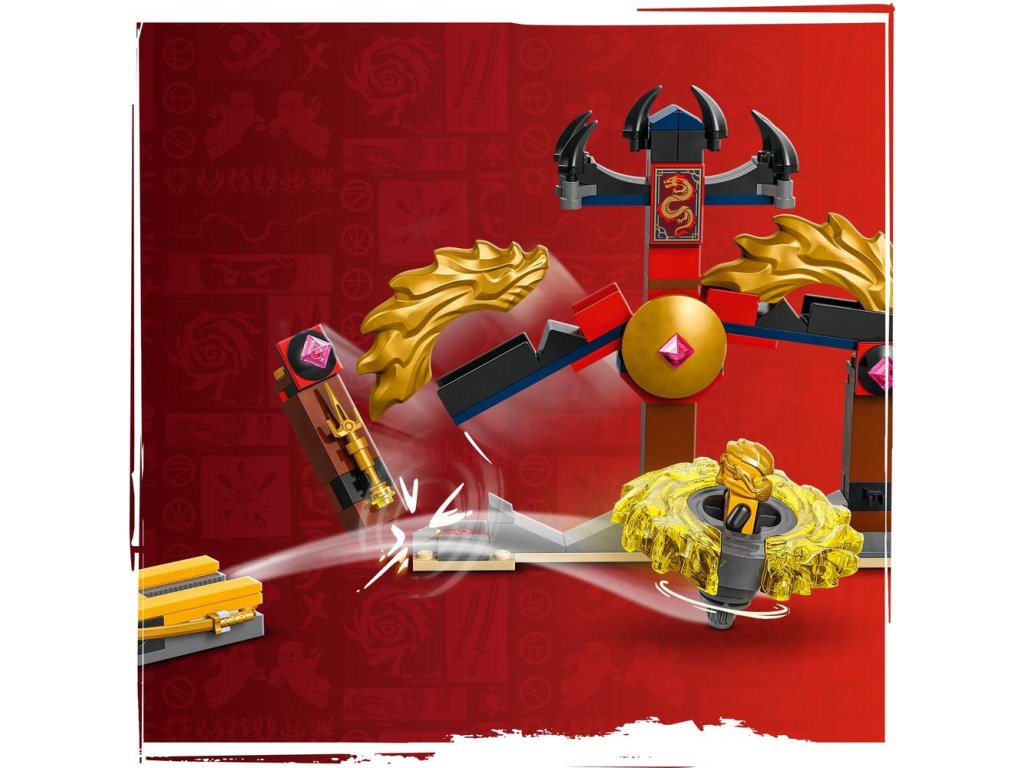 Deti si môžu vychutnať skvelé dobrodružné súboje dobra proti zlu s Arinovým žltým spinnerom a Rasovým červeným spinnerom, ktoré majú odnímateľné silové prvky. Tieto postavy NINJAGO vylepšia svoje spinnery zlatými prvkami, ktoré môžu vyhrať zasiahnutím a zrútením bojovej arény.