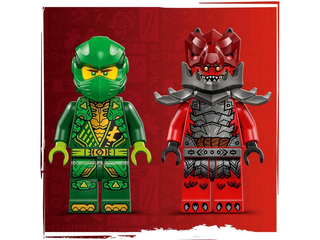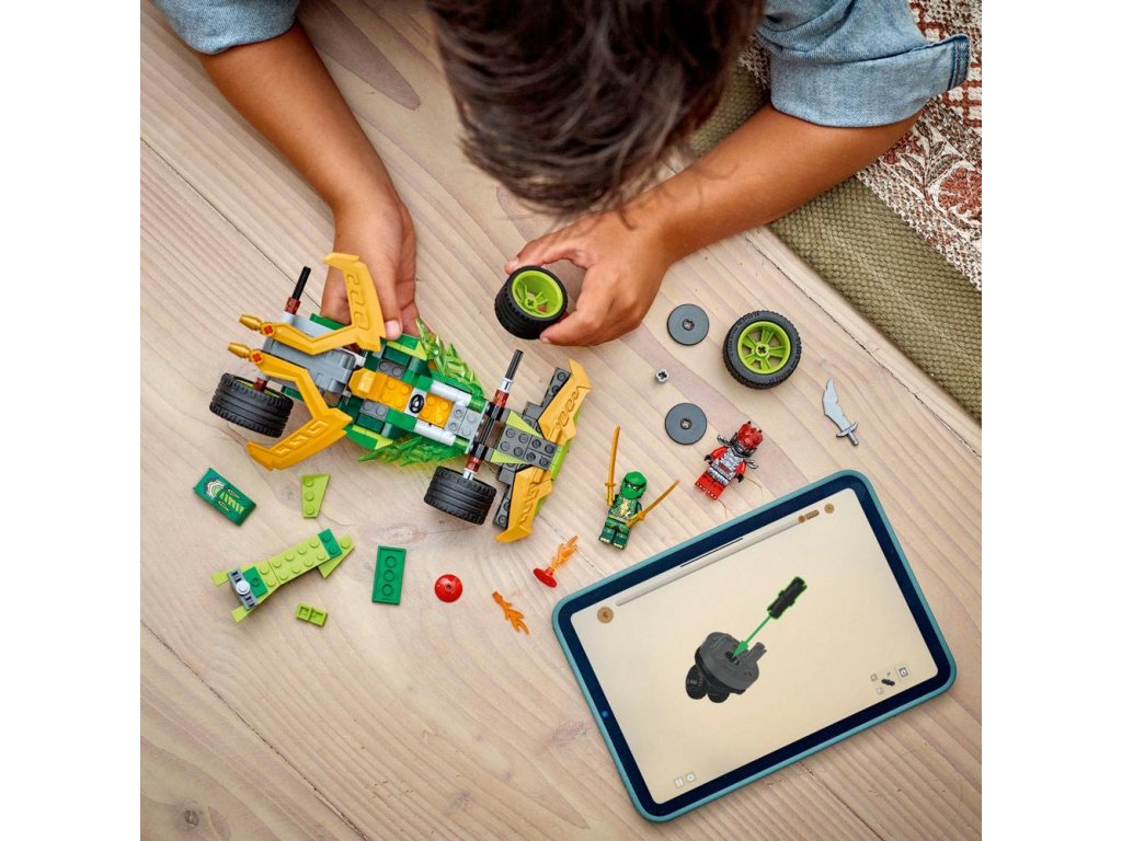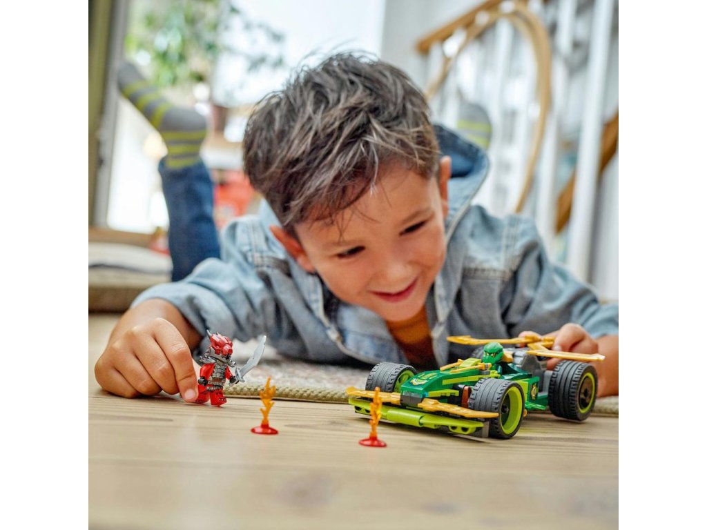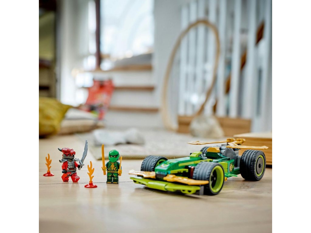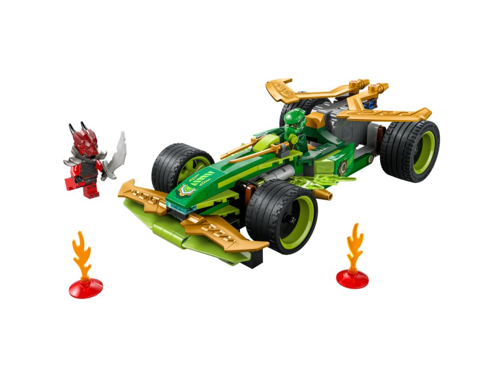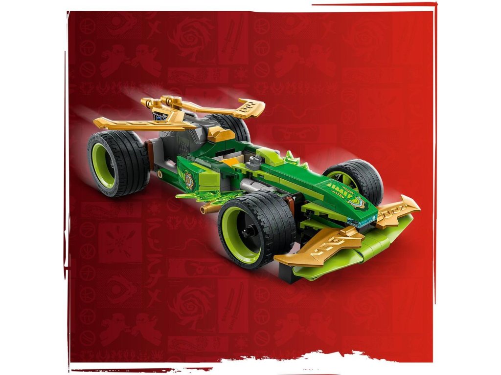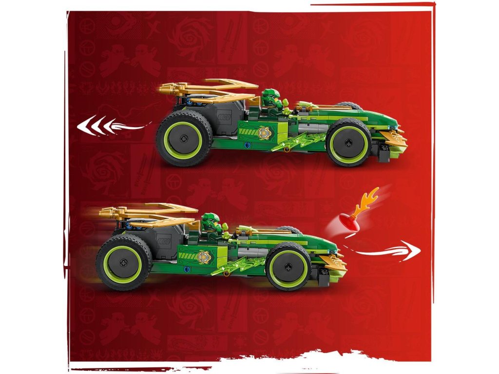 Hračkárska stavebnica obsahuje 2 minifigúrky NINJAGO: Lloyda s 2 zlatými mečmi katana a podlého Dračieho bojovníka s mečom, s ktorými si deti môžu zinscenovať napínavé bitky. Stavebnica obsahuje aj 2 svetelné prvky, ktoré vytvoria pretekárskemu autu malú prekážkovú dráhu.