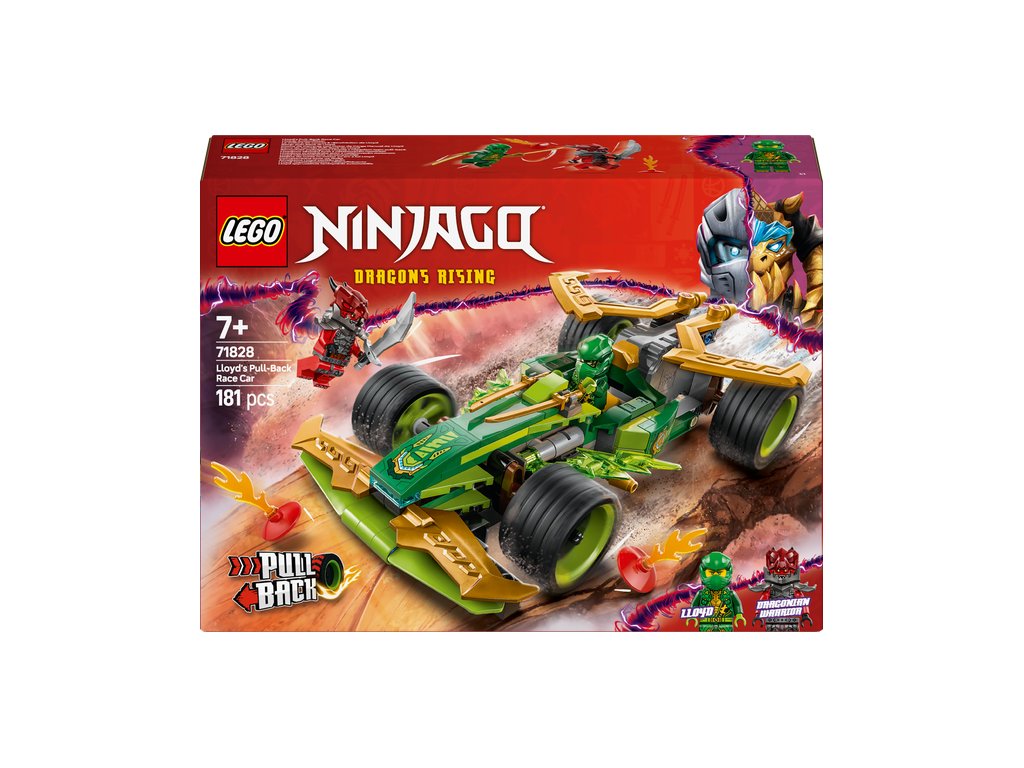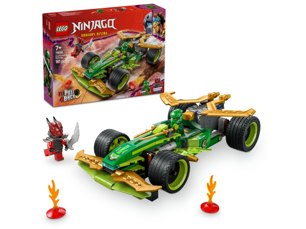 - Pretekárske autíčko na hry na postavy – Chlapci a dievčatá od 7 rokov si môžu zinscenovať superrýchlu akciu z 3. sezóny televíznej relácie NINJAGO® Dragons Risings Lloydovým pretekárskym autom s naťahovacím motorom