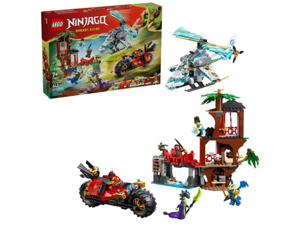 - BOJOVÉ HRAČKY PRE DETI – So stavebnicou Súboj nindža vozidiel a domček na strome (71857) sa môžu chlapci a dievčatá od 7 rokov zahrať na bojové scény zo 4. série televízneho seriálu NINJAGO® Dragons Rising