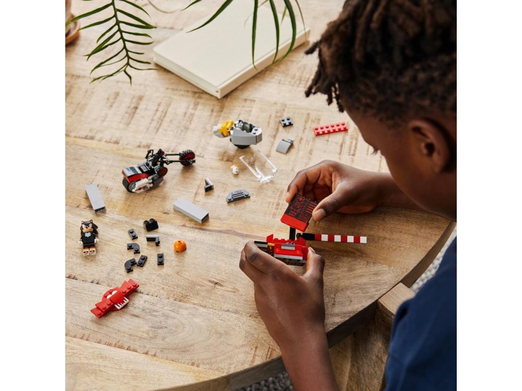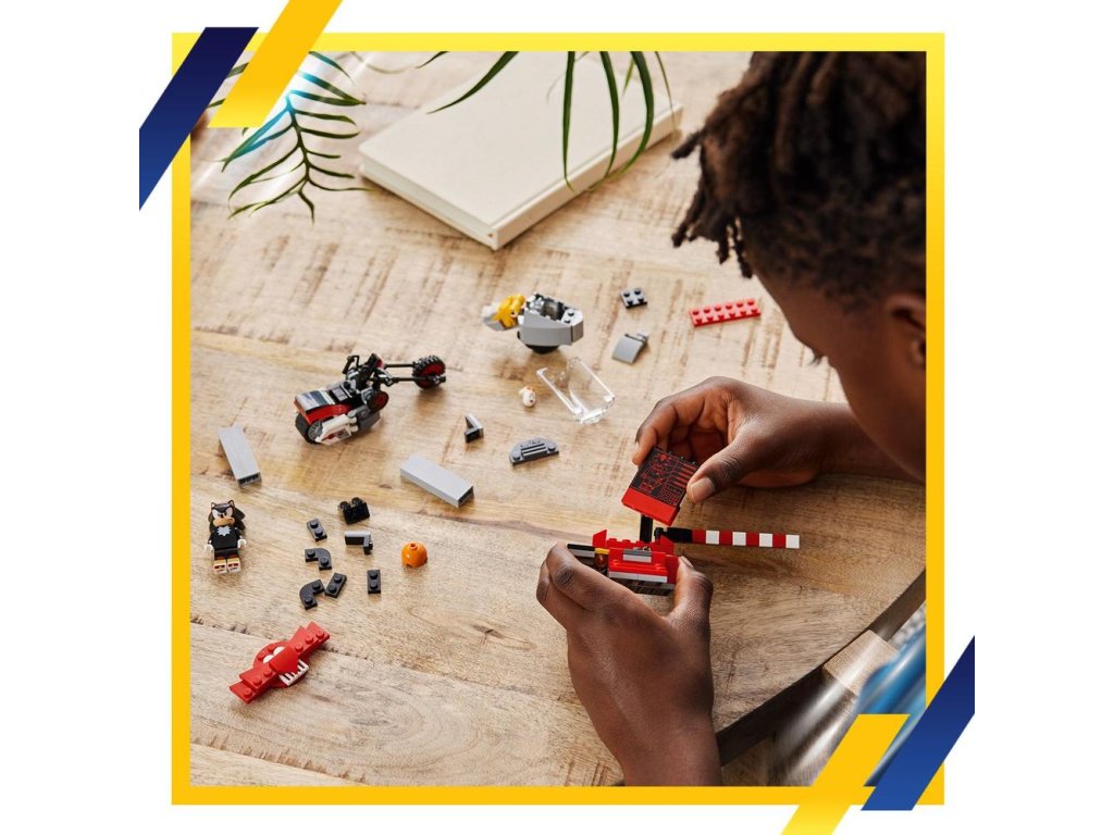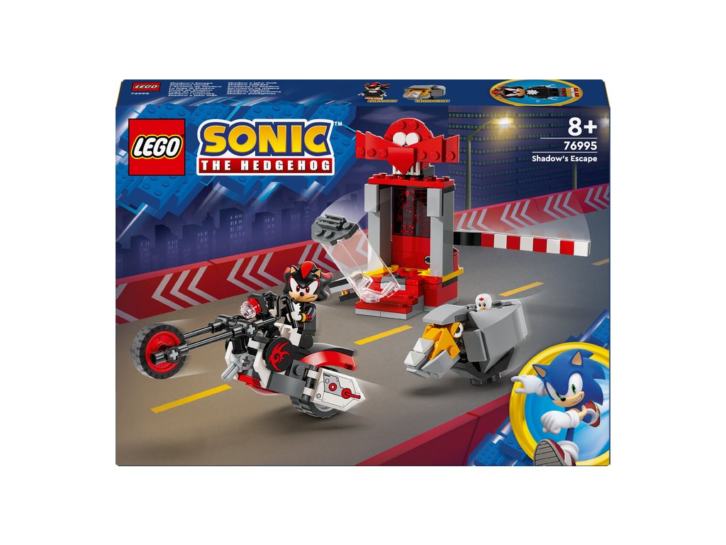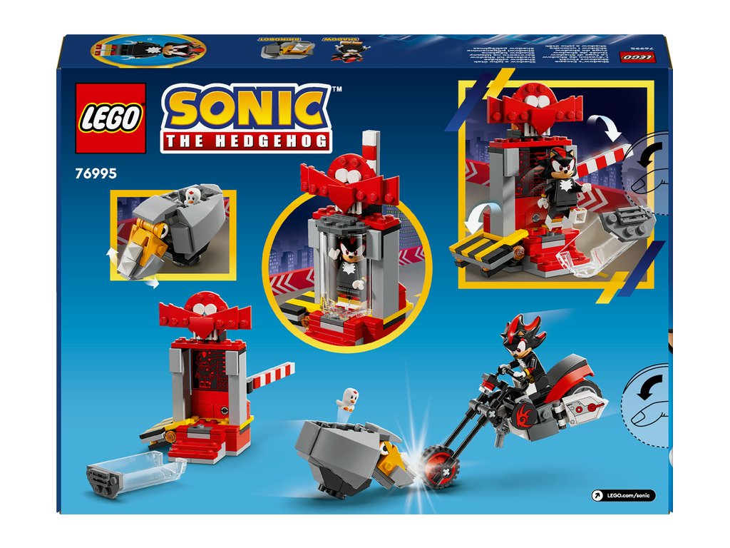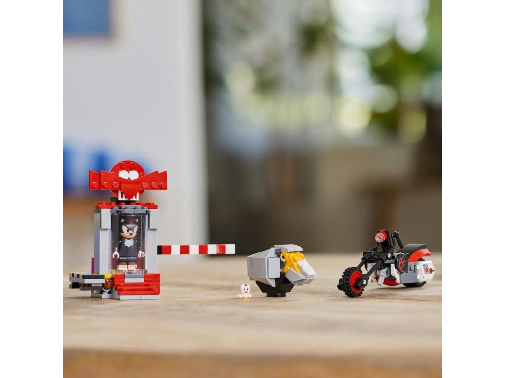Neskôr sa zabavia pri oslobodzovaní Shadowa zo stázovej komory laboratória a pri pretekoch na jeho motorke okolo padajúcej barikády, než zničia Badnika, RhinoBota (ktorý vypustí Cluckyho) a utečú. Stavebnica je plná herných možností, ktoré podnietia rozprávanie príbehov. Deti môžu vymýšľať zábavné spôsoby, ako sa Shadow vzoprie RhinoBotovi predtým, než unikne na motorke. Rýchla akčná zábava v kombinácii s kreatívnymi spôsobmi hry: také sú hračky zo série LEGO Sonic the Hedgehog™. Chlapci, dievčatá a fanúšikovia Modrej škvrny si zamilujú tvorbu inšpiratívnych scén s 3 obľúbenými akčnými figúrkami Sonica. Deti si tiež môžu užiť jednoduché a intuitívne staviteľské dobrodružstvo s aplikáciou LEGO Builder, v ktorej si môžu približovať a otáčať svoje modely v 3D rozhraní, ukladať stavebnice a sledovať svoj pokrok.