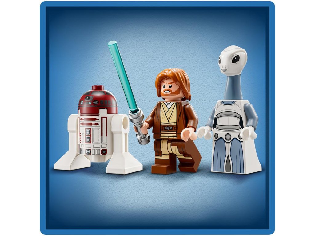 - 2 minifigúrky LEGO® – Obi-Wan Kenobi so svetelným mečom a úplne prvýkrát aj Taun We. Nechýba ani figúrka LEGO astromechanického droida