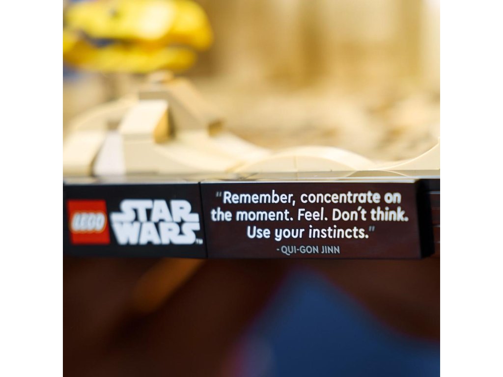 Pôsobivý zostaviteľný model na vystavenie sa dodáva s ceduľkou so známym výrokom Qui-Gon Jinna („Pamätaj. Sústreď sa na tento okamih. Cíť. Nepremýšľaj. Ver jeho inštinktu.“) a kockou k 25. výročiu LEGO Star Wars .