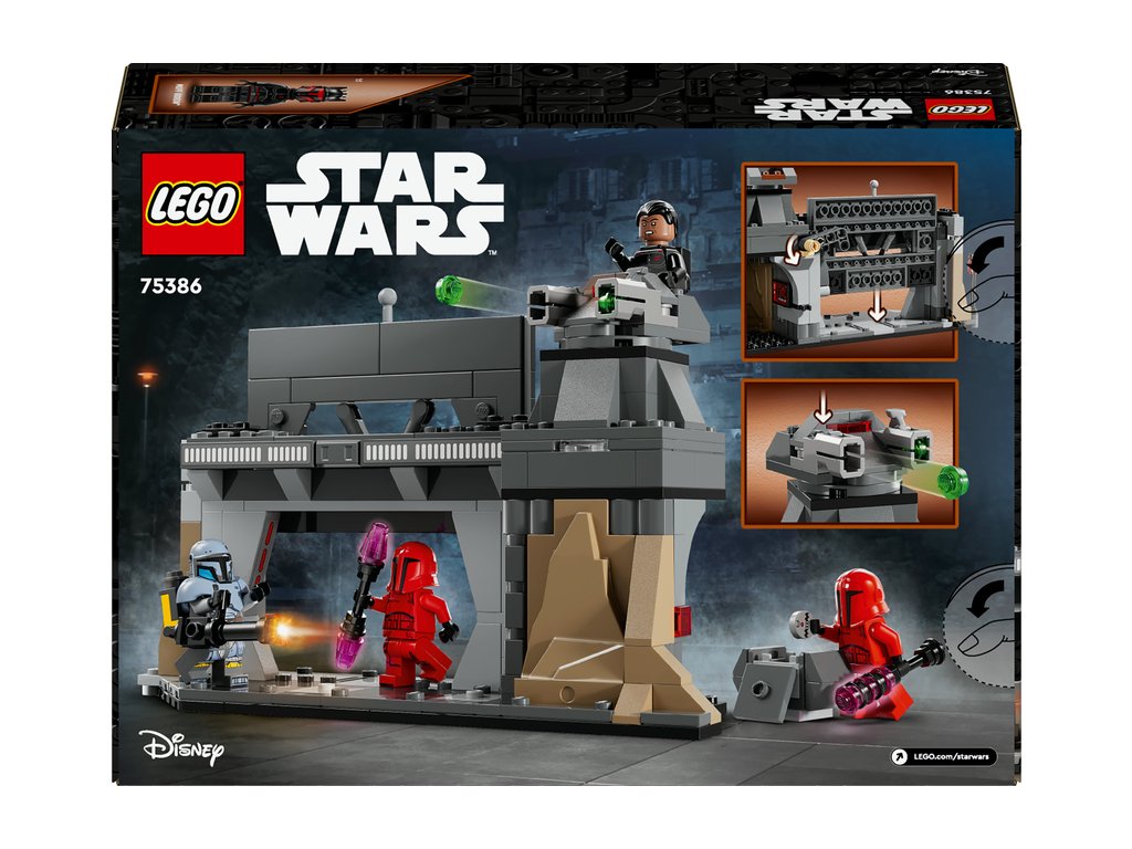 Postavte si kultové napínavé scény z 3. série seriálu Star Wars: The Mandalorian s touto stavebnicou LEGO® Star Wars™ Súboj Paza Vizsly a Moffa Gideona (75386). Model je ideálny pre chlapcov, dievčatá a všetkých fanúšikov od 7 rokov a poslúži ako štýlový fantasy darček z kociek LEGO. Stavebnica obsahuje Mandaloriánsku základňu s obrnenými dverami so spúšťačom, ktorý sa zabuchuje, ovládacími panelmi a rotujúcou vežou vystreľujúcou projektily. K dispozícii sú tiež 4 zberateľské minifigúrky zo sveta LEGO Star Wars: Mandalorian, s ktorými si môžete zahrať súboj Paza Vizslu proti Moffovi Gideonovi (v brnení Dark Troopera) a Imperiálnej prétoriánskej stráži, ako aj doplnky vrátane jetpacku Moffa Gideona a úložného boxu prvok tepelnej rozbušky pre tvorivé hry.