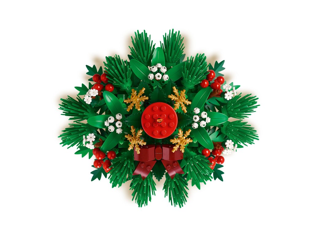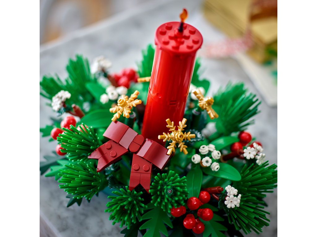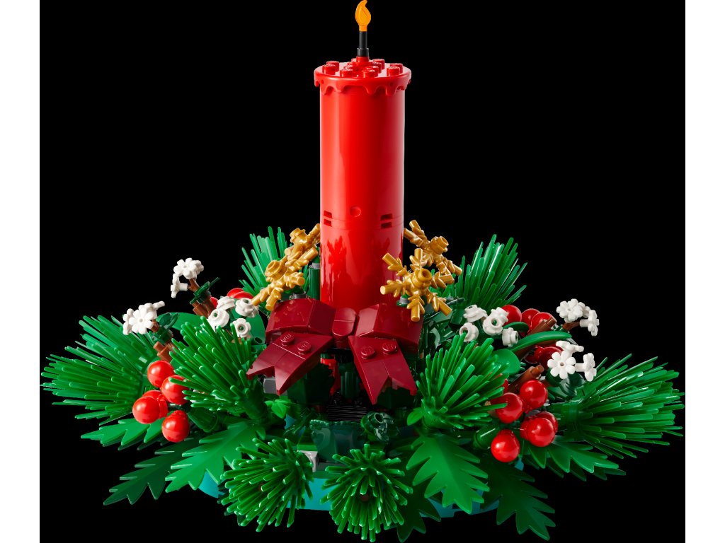 - Čas radosti a veselosti – Vianočná stavebnica LEGO® má v strede červenú sviečku obklopenú červenými bobuľami, zlatými hviezdami a zeleným lístím