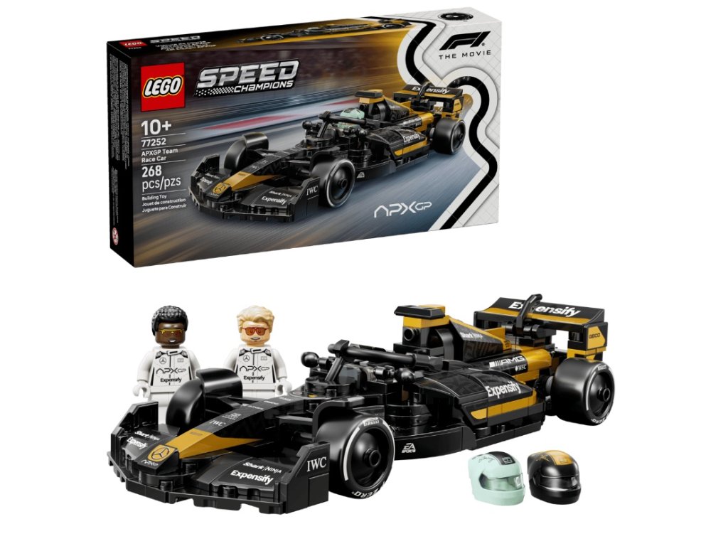 Chlapcov a dievčatá od 10 rokov nadchne stavanie, vystavovanie a pretekanie s týmto modelom LEGO® Speed Champions Pretekárske auto tímu APXGP z filmu F1® (77252). Stavebnica auta z kociek obsahuje množstvo rovnakých dizajnových detailov ako jej filmová verzia, ktorá ovládla plátna kín v roku 2025. Hračkárske auto F1 sa pýši dizajnovými detailmi podľa filmového vozidla vrátane čierno-zlatej pretekárskej grafiky, nálepiek sponzorov a širších zadných pneumatík s logom „Pirelli“. Súčasťou stavebnice sú aj 2 minifigúrky jazdcov F1 z filmu, Sonny Hayes a Joshua Pearce. Každý z nich má vlastnú prilbu s podpisom, parochňu a francúzsky kľúč, ktorý sa dá použiť aj na nalepovanie nálepiek a oddeľovanie kociek. Stavebnice LEGO® Speed Champions potešia ako skvelý darček pre deti a automobilových fanúšikov, ktorí si s nimi môžu postaviť repliky niektorých z najikonickejších vozidiel na svete. Pomocou aplikácie LEGO Builder môžu vytvárať každý model s istotou – stavebnicu v nej dokážu približovať,otáčať v 3D prostredí a sledovať svoj pokrok v rámci prehľadného digitálneho návodu. Stavebnica obsahuje 268 dielikov.