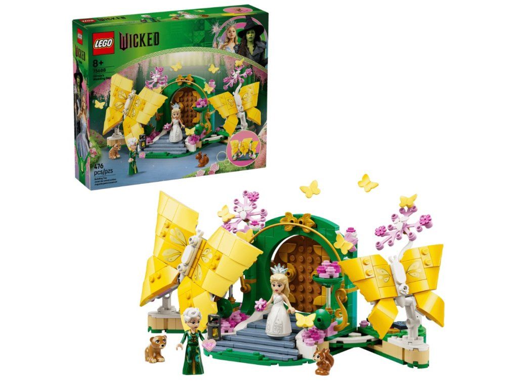 Deti rozoberú obrovské polohovateľné motýle LEGO a odhalia celú svadobnú scénu. Tento fantasy darček je plný známych filmových detailov vrátane svadobnej torty, pozvánky v tvare srdca a Glindinej kytice od Fiyera. S touto stavebnicou vás čakajú autentické hry na postavy: Glinda má oblečené svadobné šaty a korunku, presne, ako vo filme, a má dve rôzne tváre, ktoré môžete vymeniť, keď sa jej deň zmení z radostného na katastrofický. Súčasťou modelu sú aj zvieracie postavičky, ktoré sa rútia naprieč scénou.