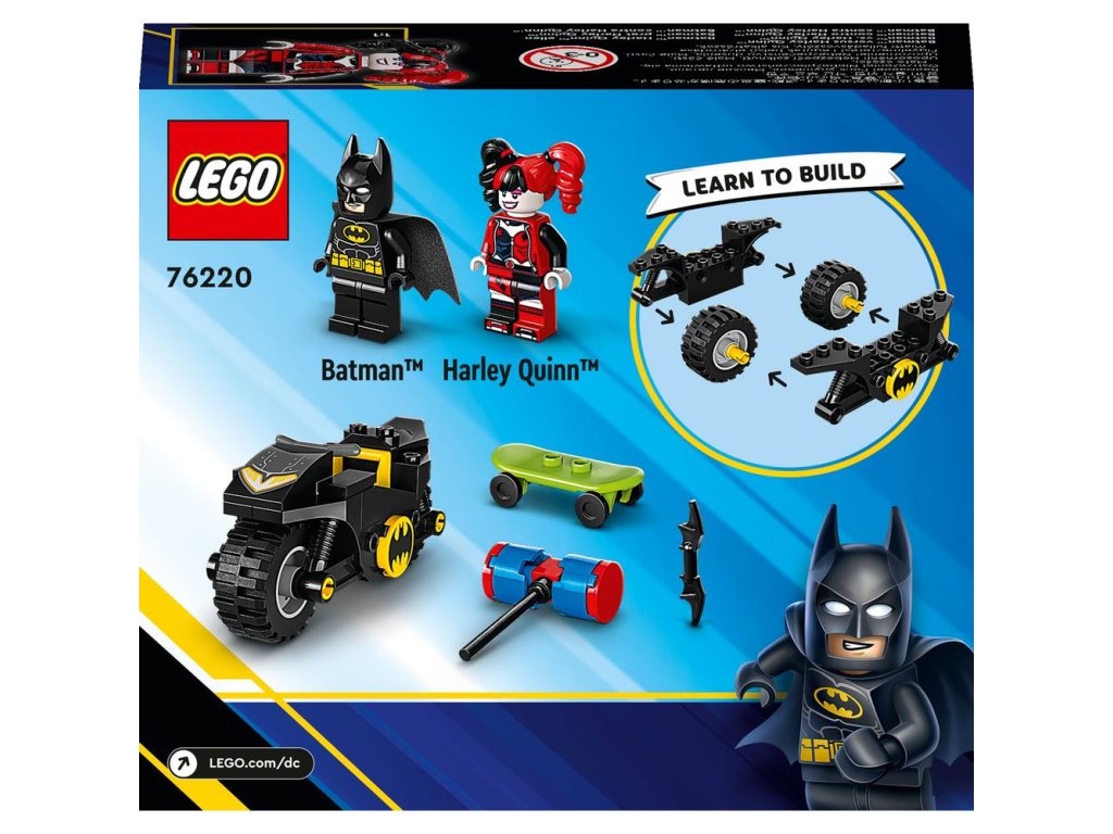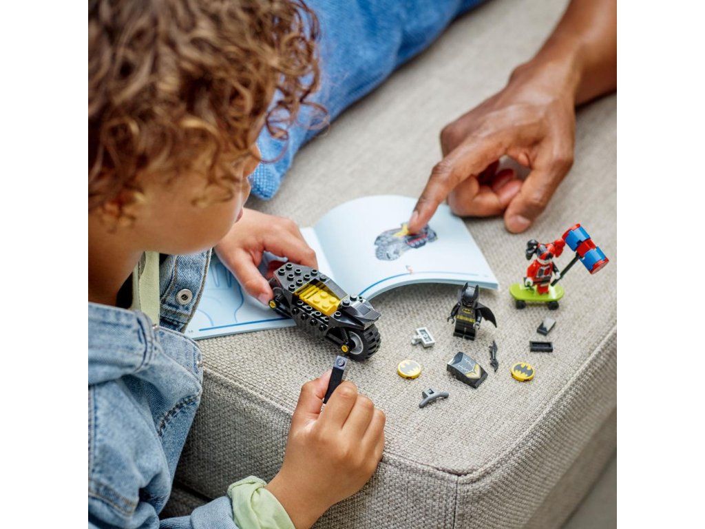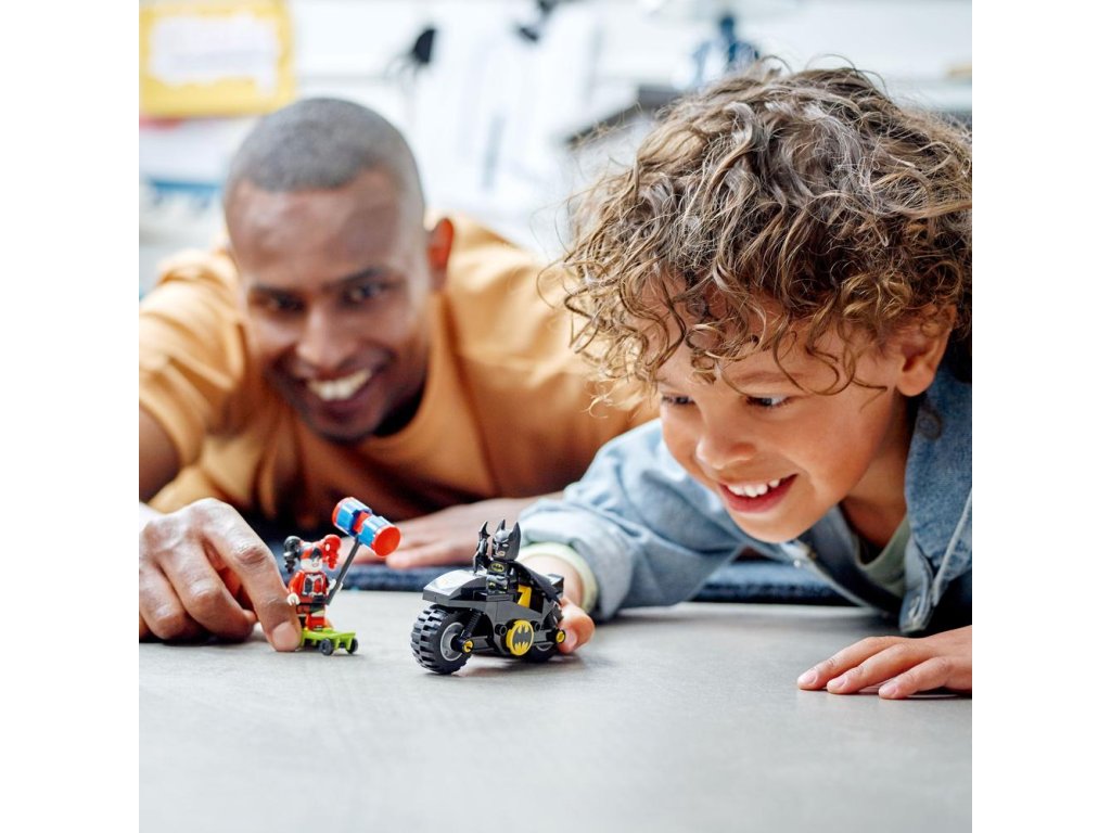 Stavebnica LEGO® DC Batman™ proti Harley Quinn™ (76220) obsahuje klasické postavy, parádne vozidlá a úžasné doplnky, ktoré v deťoch od 4 rokov prebudia záujem o spoločné hry plné rozvoja. Ten najlepší začiatok pre malých superhrdinov Táto akčná stavebnica s motorkou obsahuje 2 obľúbené postavy zo superhrdinských filmov od štúdia DC: Batmana na svojej výkonnej motorke Batcycle™ a Harley Quinn na skejtborde s nadrozmerným kladivom. Stavebnice LEGO 4+ sú plné pútavých detailov, vďaka ktorými sa deti môžu tešiť na ten najlepší zážitok z hry. Každé z vrecúšok v balení obsahuje jeden celý model a postavičku, aby sa deti mohli ihneď pustiť do hier. Súčasťou je aj štartovacia kocka na rýchlejšie postavenie motorky a nechába ani obrázkový návod zapracovaný do príbehu. Skvelá zábava pre celú rodinu Stavebnice z radu 4+ sú výnimočné tým, že umožňujú spoločnú hru dospelých a detí, či už sú skúsenými stavi
