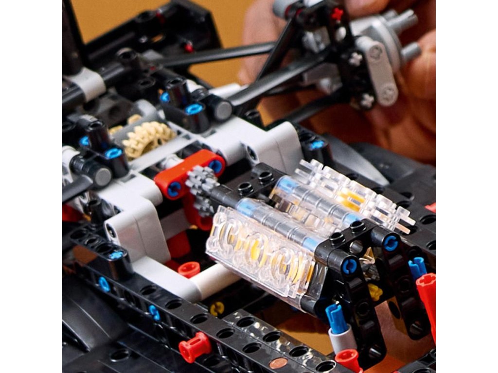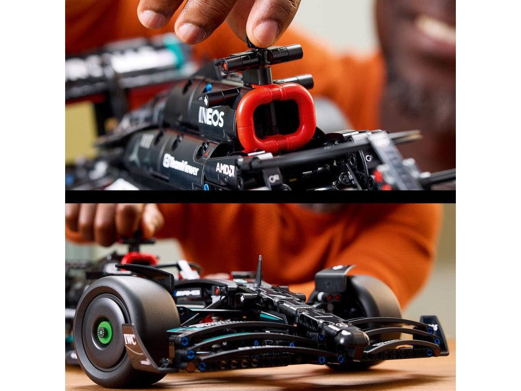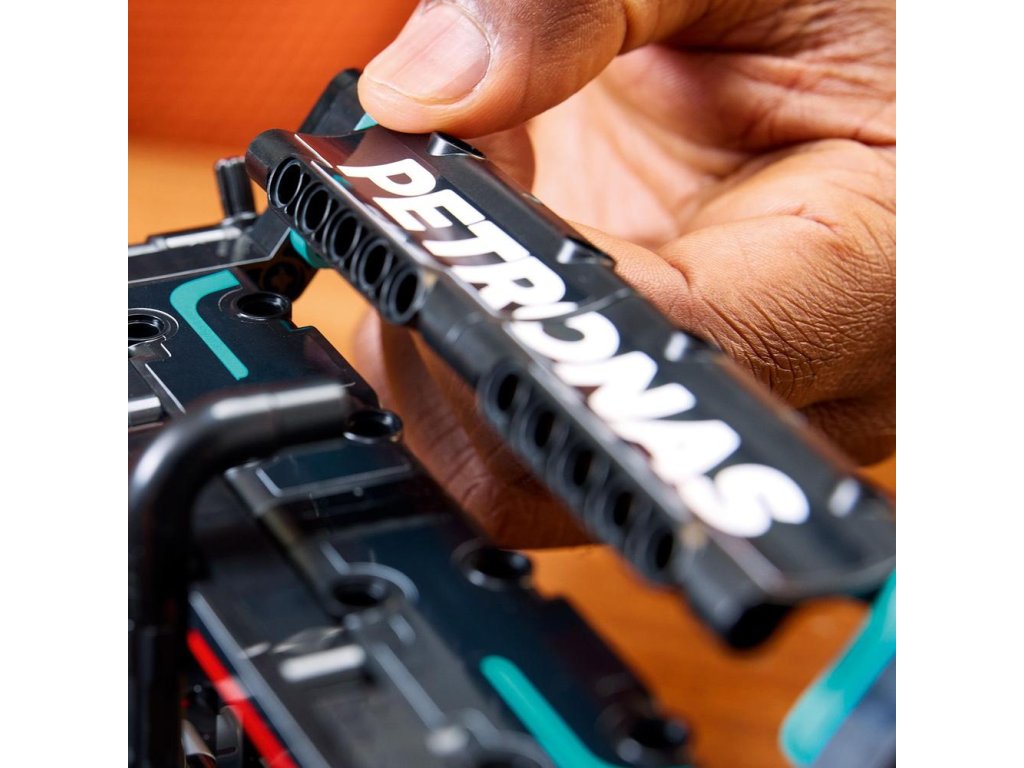 Medzi funkcie auta patrí riadenie, ktoré možno ovládať volantom alebo gombíkom na vrchu vozidla. Odpojením motora odhalíte diferenciálny 6-valcový motor s pohyblivými piestami. Tento skutočne prepracovaný model obsahuje aj otváracie krídlo inšpirované systémom DRS reálneho auta a bude tak skvelým nápadom na darček pre dospelých fanúšikov Mercedes F1, preteky a skvelých stavebných modelov LEGO.