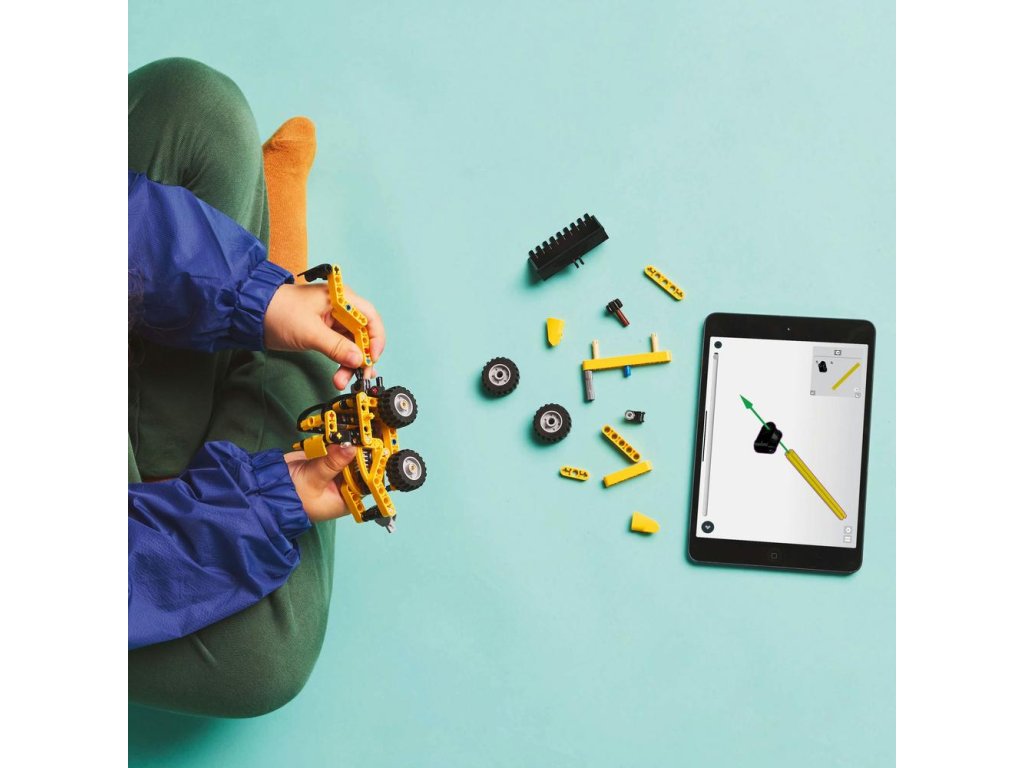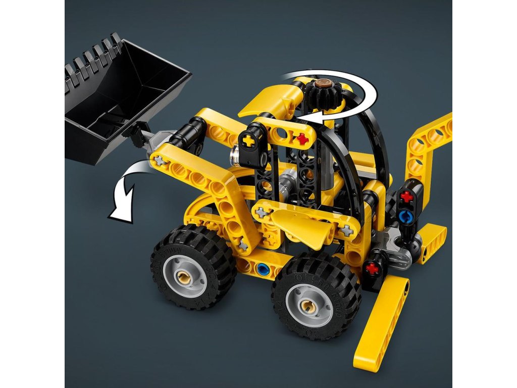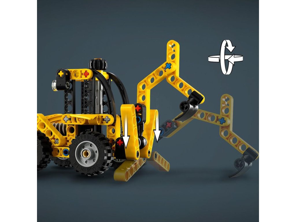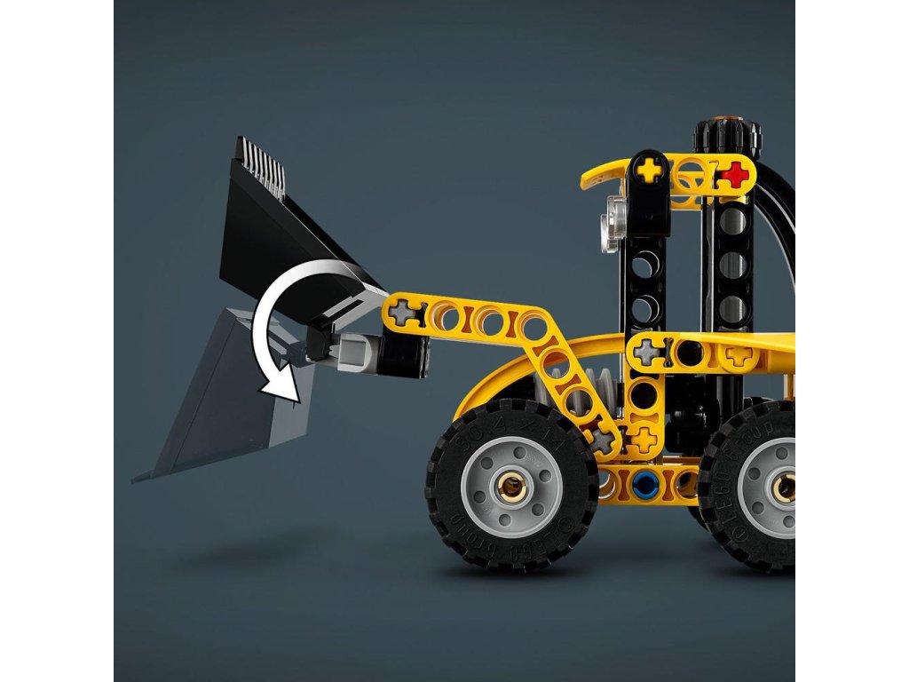 - Otestujte lopatu a rýpadlo – Model LEGO® Technic Zadný nakladač obsahuje lopatu, ktorú môžu deti zdvíhať a spúšťať pomocou gombíka, zadného rýpadla a podpier